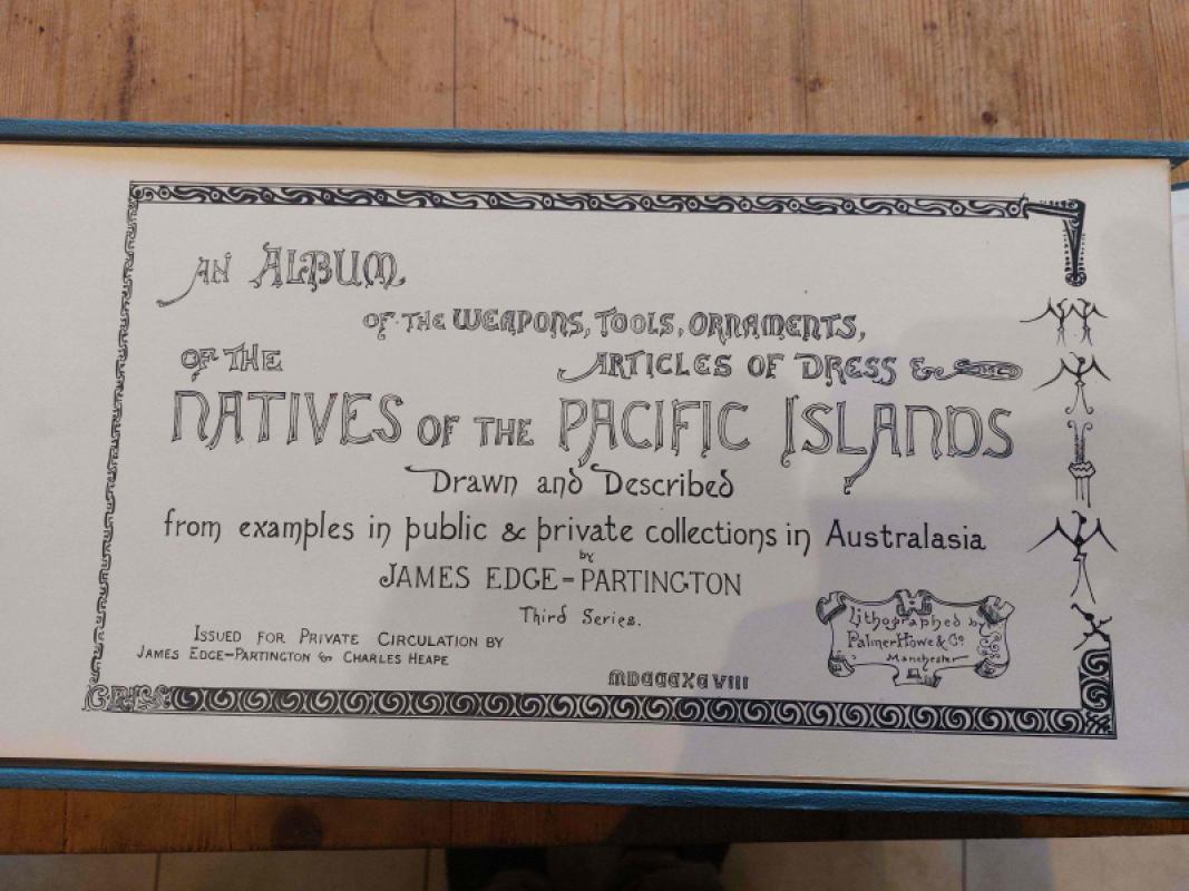 Title sheet reads: An album of the weapons, tools, ornaments, articles of dress &c. of the natives of the Pacific islands. Drawn and described from examples in public & private collections in Australasia by James Edge-Partington. Third series. "Lithographed by Palmer, Howe & Co., Manchester". printed to recto only, illustrated with line drawings; some foxing to the pictorial label on the box, internally very clean and bright; contained in the original blue cloth-bound portfolio box slightly rubbed, complete with brass clasp with some corrosion, a very good copy.