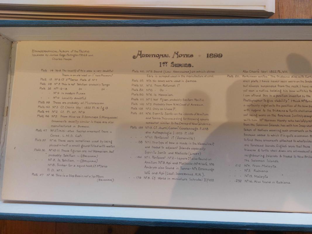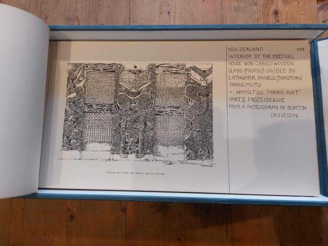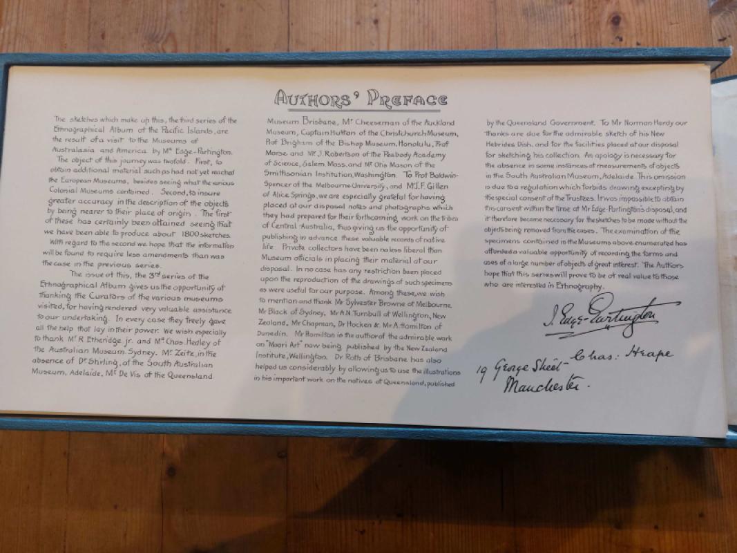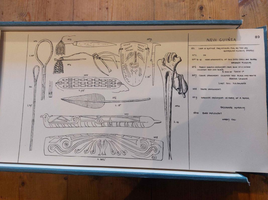 The third of the three landmark ethnographical albums produced by the British ethnologist and tribal art collector James Edge-Partington from 1890 to 1898, this album illustrated with art and artefacts from Tahiti, Hawaiian Islands, Marquesas, Fijian Islands, Solomon Islands, New Britain, New Ireland, Admiralty Islands, Micronesia, New Hebrides, New Caledonia, New Guinea, Australia and New Zealand. The objects were drawn by him from examples in major public and private collections in Australia and New Zealand. Objects from Edge-Partington's personal collection can be found in the British Museum and the major Australian and New Zealand museums.