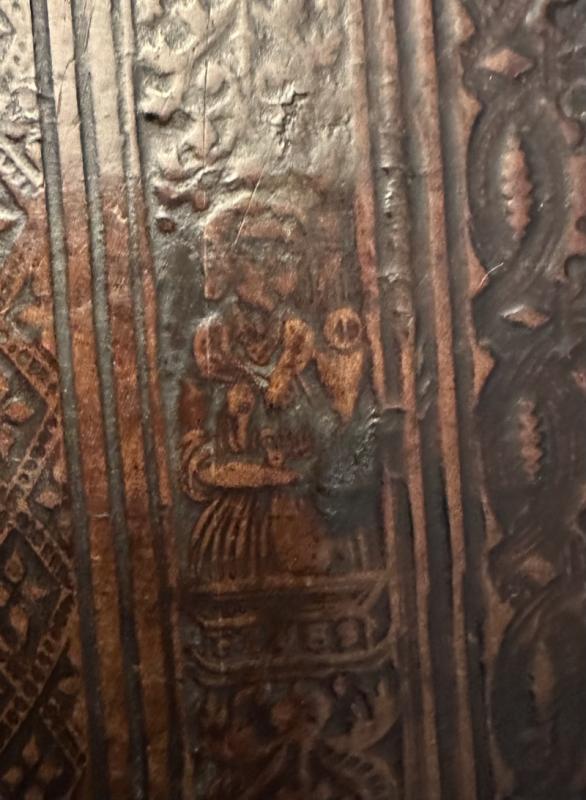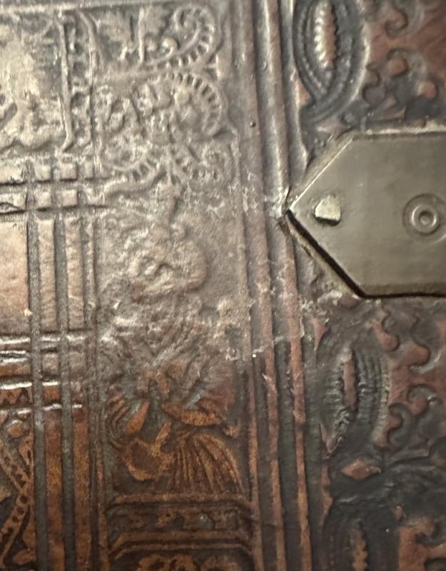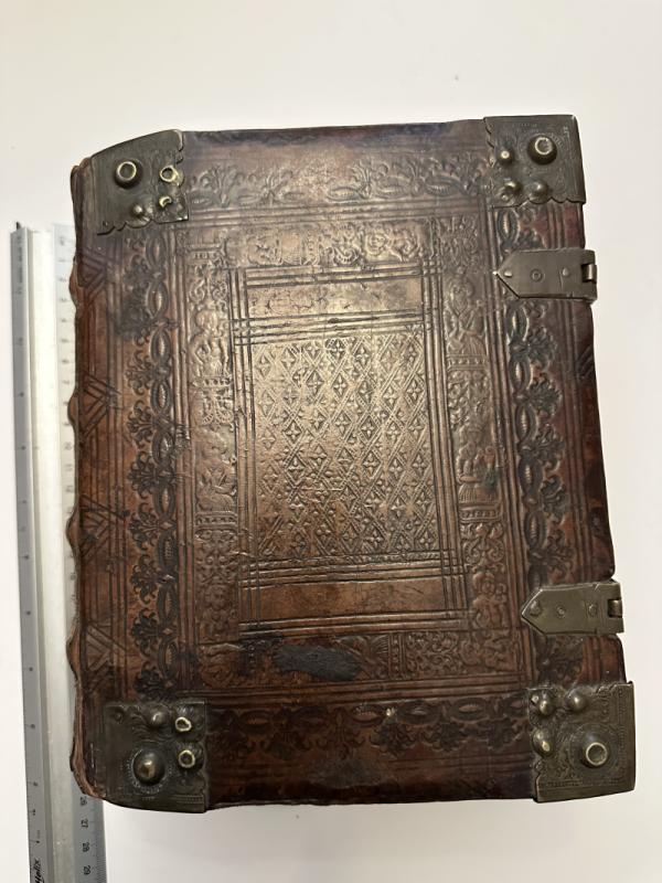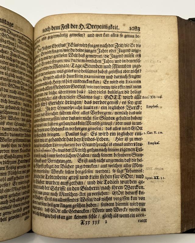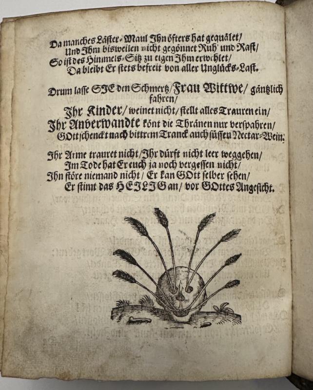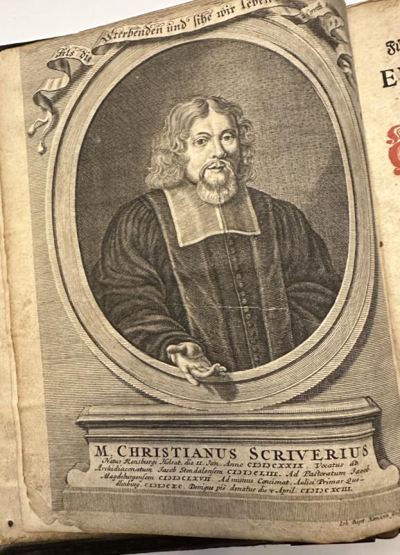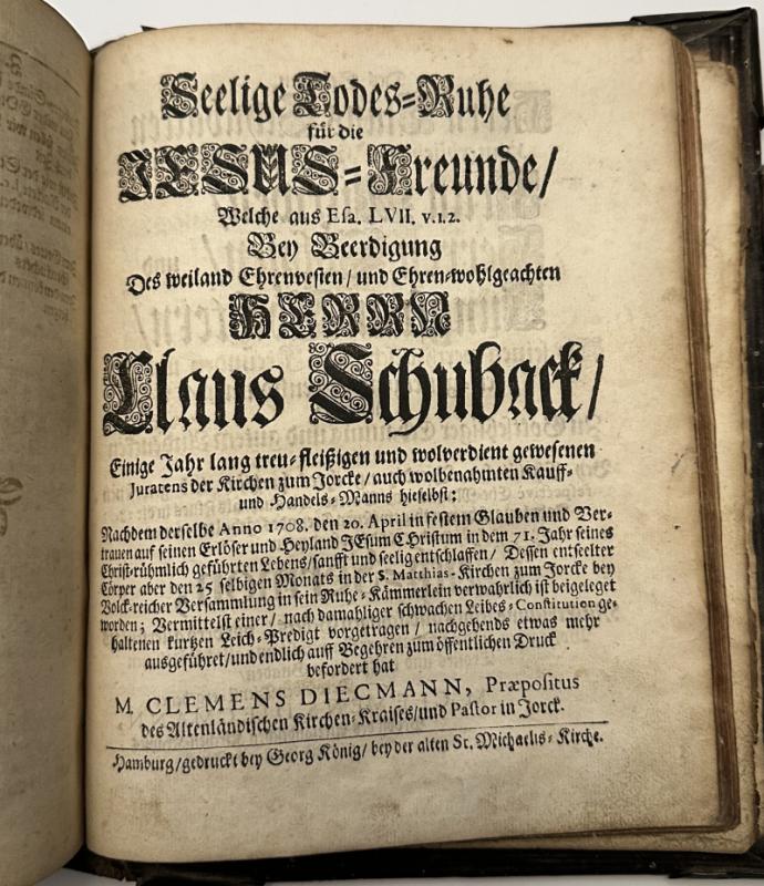 [xii], 1440, [64] pages + frontispiece. Bound with at the rear Seelige Todes-Ruhe [...] bey Beerdigung des [... ]Herrn Claus Schuback [...] 1708, den 20. April [...] by M Clemens Diecmann - Hamburg: Konig, c1708. 60, [4] pages. In old leatehr covered wooden boards with embossed figures of Faith, Hope and Charity. Brass corners. Modern labels to the spine. Binding rather rubbed and worn. With working clasps. Some repairs to the binding, mainly the spine. New front free end paper. Blind embossed stamp of a previous owner to the rear free end paper. Pages browned throughout