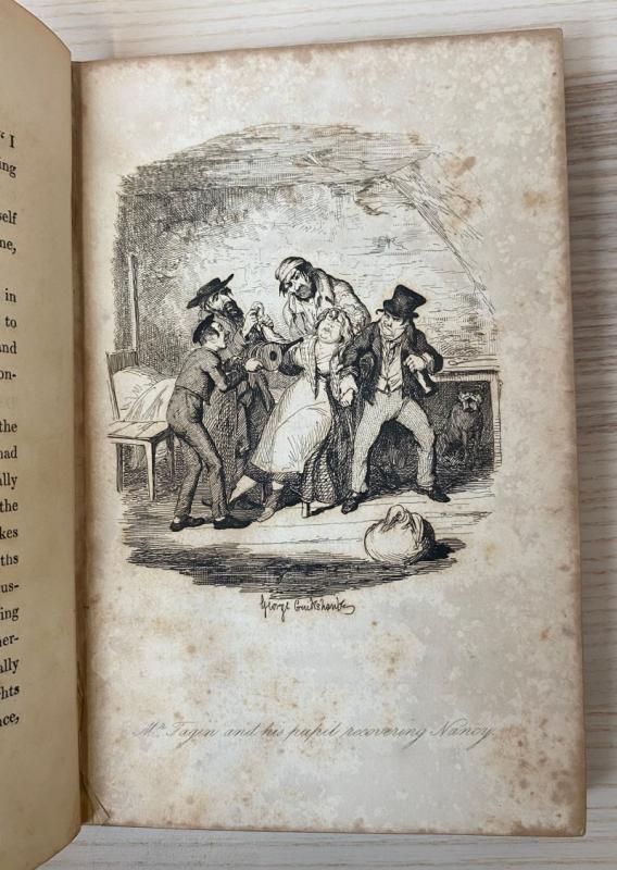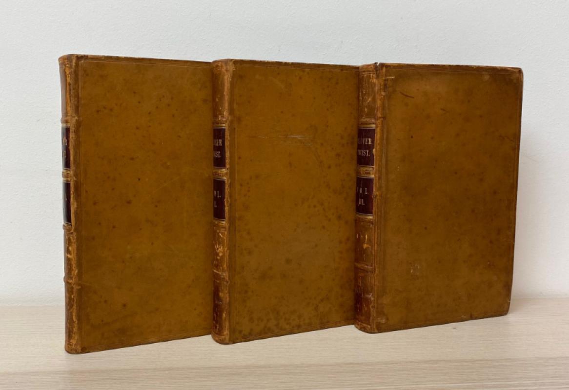 First edition, first issue, with Charles Dickens named as Boz to the title page and the Fireside plate opposite p313 in Volume III. Bound without the half titles or publisher's advertisements. Bound in contemporary full calf, with original red morocco gilt spine labels. Some occasional rubbing to the spines, the odd mark to the boards, the extremities a touch bumped. Spine labels smart with just light occasional rubbing. Discolouration towards the spines of the two later volumes, a few light ring marks to the front board of Volume II, else externally lovely. Armorial bookplate of John Angerstein to the front pastedown of each volume; Angerstein was an art collector whose estate was purchased by King George IV and Lord Liverpool to form the beginnings of the National Gallery. Bindings remaining generally firm, with just light straining at the hinges, noticeable at p2-3 of volumes I and II, Page 250 with loss of 3.5" x 2" to lower corner, presumably contemporary from a candle catching. There are handling marks and stains throughout, occasional light spots, plates are a little foxed and with some offsetting to leaves facing. Collated and complete with twenty-four etched plates by George Cruikshank, including the Fireside plate. A lovely true first edition in smart contemporary leather.
