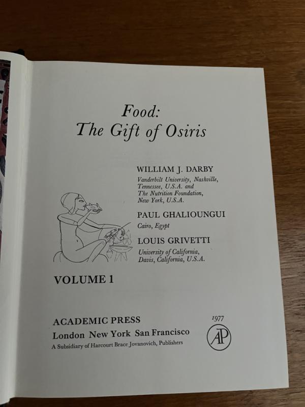 ‘Food - The Gift of Osiris; in 2 Volumes’ by William Darby, Paul Ghalioungui & Louis Grivetti; pub by Academic Press, London. Vol 1 1977 & Vol 2 1976. Covers in black buckram with gilt design on front & back covers and title in gilt lettering on spine; silk head bands top & bottom. 4to - c 7” x 9”. Vol 1, 528pps, vol 2, 520pps. Occasional colour plates and numerous b&w plates in each volume; some very slight foxing on edges; otherwise both books are in mint condition. Books weigh 3 kg.