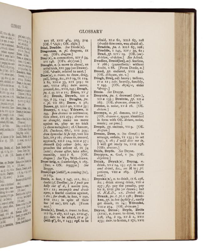 First edition, early issue of Tolkien’s A Middle English Vocabulary, bound with Sisam’s Fourteenth Century Verse and Prose as issued by the publisher. Before starting work on his edition and glossary of Sir Gawain & the Green Knight (1925), Tolkien compiled this Middle English vocabulary – his first substantial, stand-alone publication in the field. Aiming neither at completeness, nor to provide ‘primarily a glossary of rare or “hard” words’, Tolkien explains his rationale thus: ‘A good working knowledge of Middle English depends less on the possession of an abstruse vocabulary than on familiarity with the ordinary machinery of expression […]. So in making a glossary for use with a book itself designed to be a preparation for the reading of complete texts, I have given exceptionally full treatment to what may rightly be called the backbone of the language’ (‘Note’, A Middle English Vocabulary, p. [3]). ¶¶