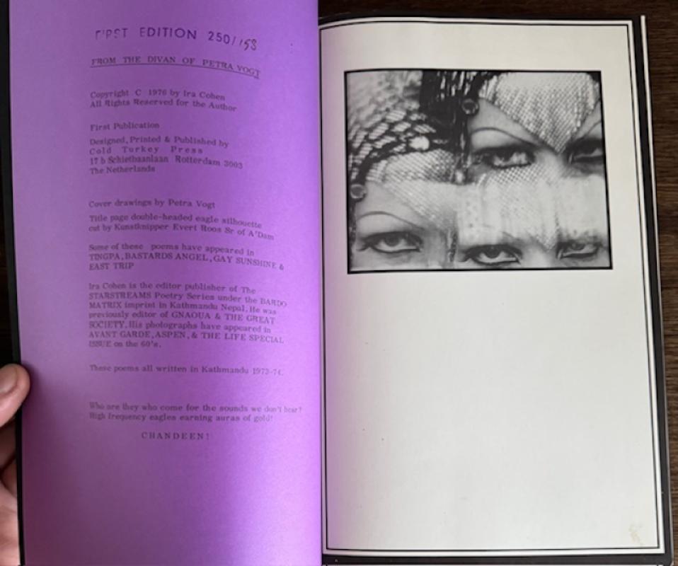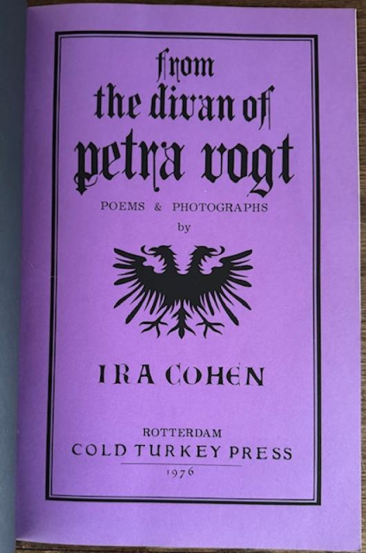 = From the Divan of Petra Vogt by Ira Cohen, published by the underground Cold Turkey Press in Rotterdam in 1976, is a limited-edition artist’s book blending poetry and photography created during Cohen’s time in Kathmandu in the early 1970s. It pairs his spare, evocative poems-most written 1973-74-with photographs of Petra Vogt, the German artist and performer who was his partner and muse, making the work both literary and visual in character. The edition of 250 copies showcases Cohen’s experimental, intimate approach to text and image, reflecting his broader oeuvre of Beat-inflected, mystical, and cross-disciplinary creativity. Fine copy.
