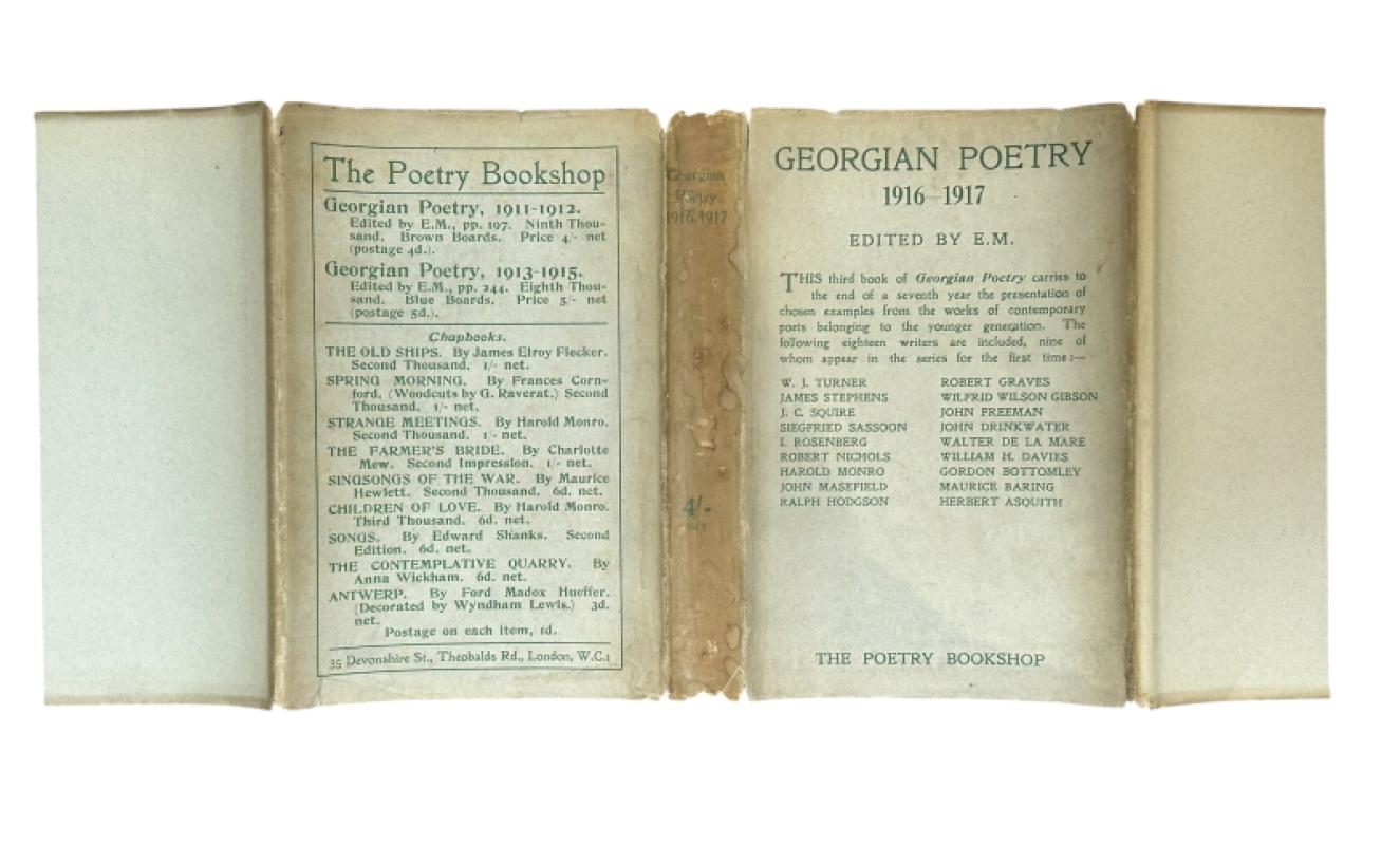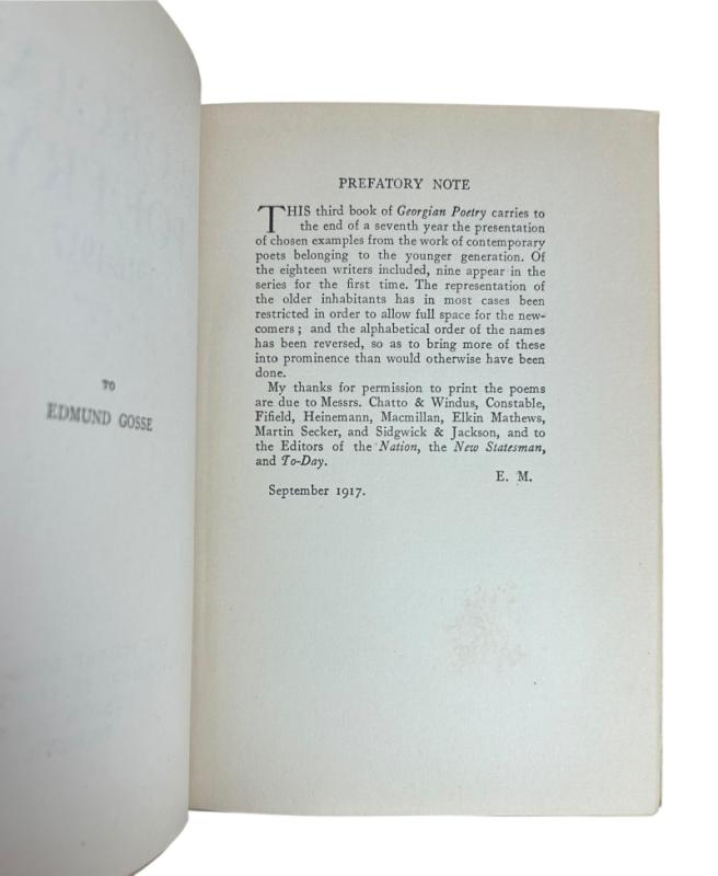 ‘This third book of Georgian Poetry carries to the end of a seventh year of the presentation of chosen examples from the works of contemporary poets belonging to the younger generation. The following eighteen writers are included, nine of whom appear in the series for the first time:– W. J. Turner; James Stephens; J. C. Squire; Siegfried Sassoon; I. Rosenberg; Robert Nichols; Harold Monro; John Masefield; Ralph Hodgson; Robert Graves; Wilfrid Wilson Gibson; John Freeman; John Drinkwater; Walter de la Mare; William H. Davies; Gordon Bottomley; Maurice Baring; Herbert Asquith’.