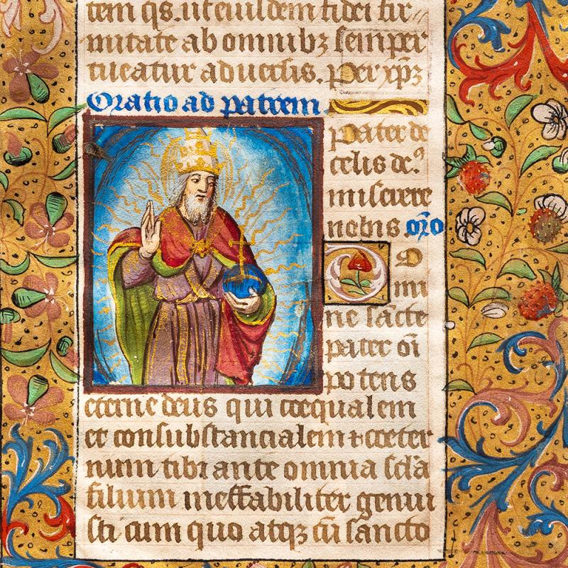 The text contains individual prayers dedicated to The Trinity. The text on the recto and half of the verso contains a prayer dedicated to God the Father; ‘Domine sa[n]cte pater’, (‘Lord, Holy Father’). The text at the end of the verso begins the prayer dedicated to The Holy Son; ‘Ad filium’, (‘To the Son’). An excellent example of a finely illuminated leaf. Very minor smudging to the blue headers and the border illumination, with very small pigment loss to the green in the lower corner of the verso. Sight rippling to the parchment, binding marks to the edge of the parchment. Offsetting to the recto of an illuminated initial, and a border to the verso.