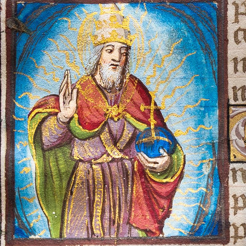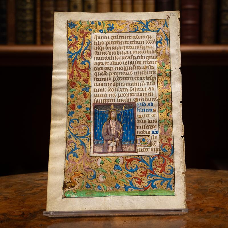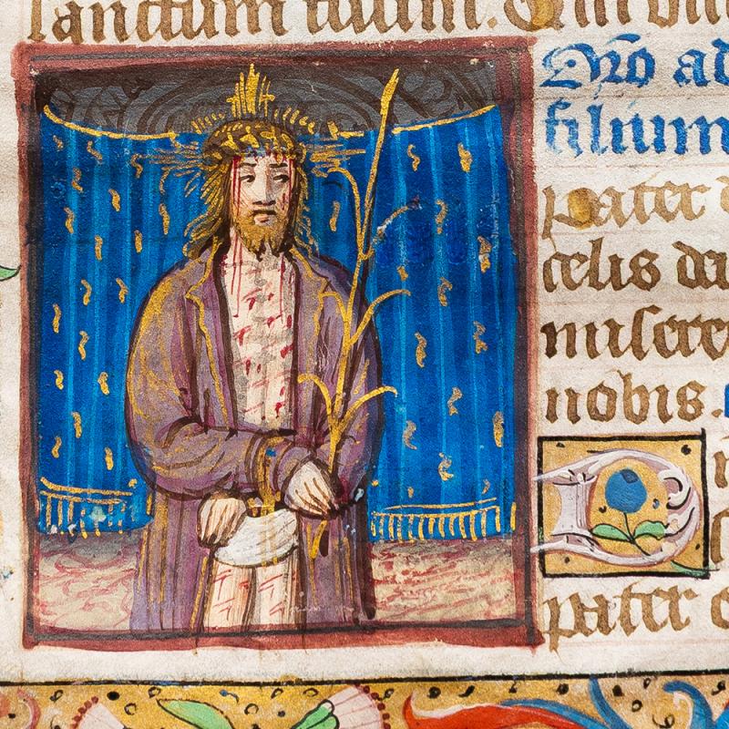Illuminated with two miniatures of God the Father and Christ, c. 45 x 39 mm (God), c. 45 x 38 (Christ) mm. God the Father clutches a cross topped orb in his left hand, while the right is raised in benediction, his eyes downcast and he is elaborately dressed on the recto. The second portrays a flagellated Christ with his hands bound, dressed in the purple robe he was dressed in before he was led out to be crucified, grasping a reed as a mock sceptre on the verso. The miniatures and text are framed by an elaborately decorated full border with flowers, strawberries, acanthus leaves of pink, red and blue with a dragon to the recto and verso of the lower edge of the border on liquid gold grounds.
