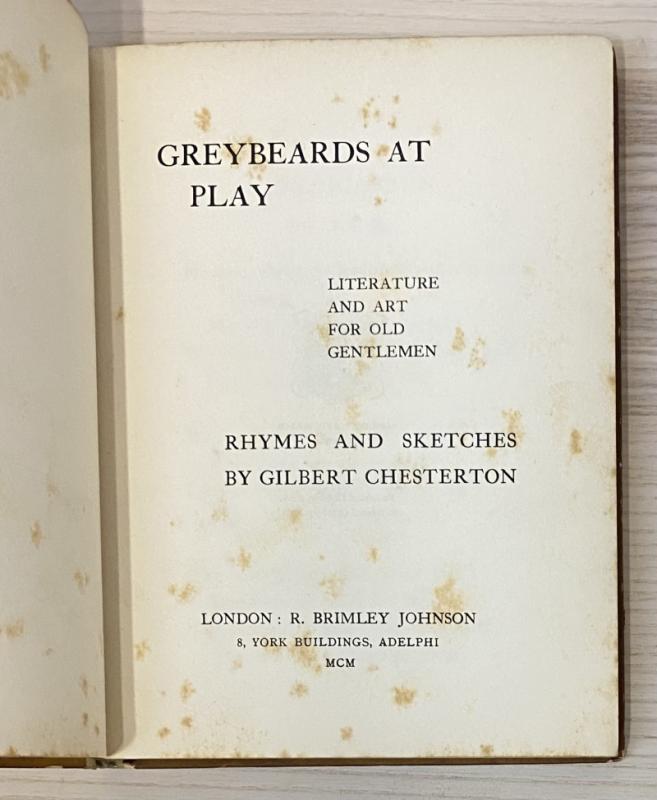 The author's first work. Bound in the publisher's quarter buckram with pictorial paper covered boards. The front board is a little discoloured and toned towards the edges, with the central illustration remaining bright; rear board a little more tired, with marks and some grubbiness. Spine a little discoloured, with some marks and wear and some bumping to the spine ends. Small neat ownership inscription to the upper corner of the front pastedown. The binding remains firm. The leaves are a little spotted throughout, heavier to prelims. Seven pages of publisher's advertisements bound to the rear. A good first edition of G. K. Chesterton's first published work.