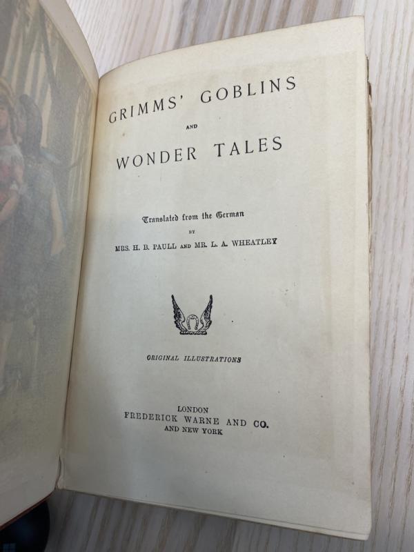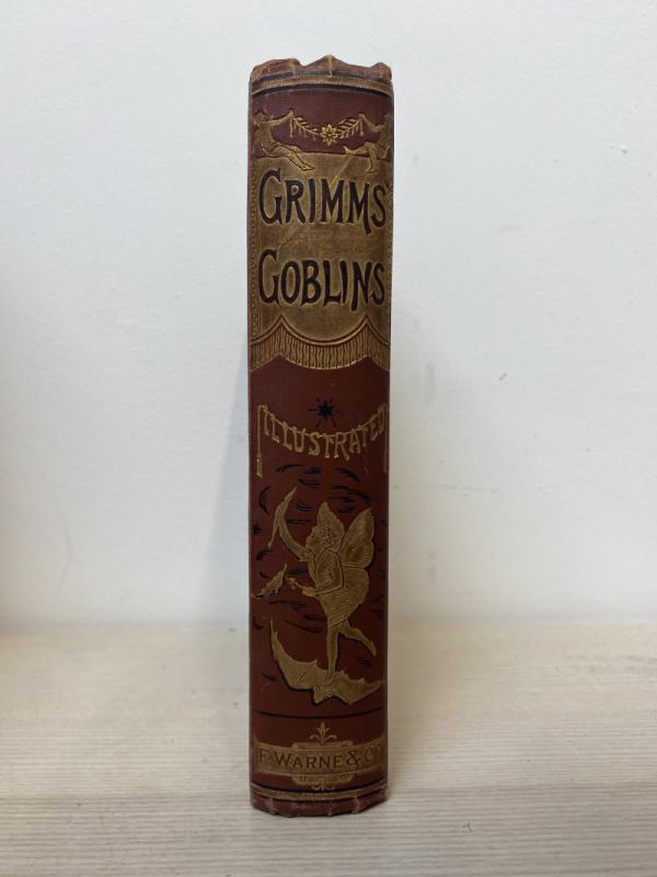 c1880. Translated from the German by Mrs. H. B. Paull and Mr. L. A. Wheatley. Illustrated with three colour plates & black and white vignettes throughout. Publisher's decorative cloth with gilt pictorial spine & front board, rather bumped to the head & tail of the spine and extremities, ring mark, scuffs and marks to boards; front hinge strained at half title page, binding very tender throughout with p.355 loose & p.357 with tear, p.83 with loss & tear to upper corner not affecting text block, a few occ. marks to pages. An uncommon late Victorian compilation of fairy stories by the Brothers Grimm in a charming gilt binding.