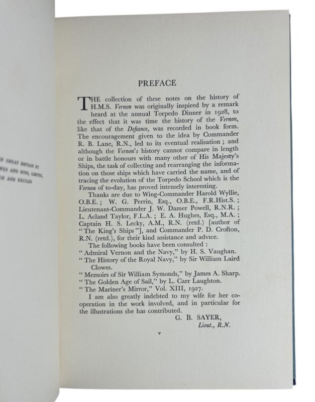 The history of H. M. S. Vernon, inspired, according to the preface, by a remark heard at the annual Torpedo Dinner in 1928. The preface alludes that G. B. Sayer’s wife contributed the internal illustrations, and perhaps maybe the dust jacket art too. The jacket appears trimmed – however, there are 90 degree marks on each flap, confirming that it was trimmed by hand and mismeasured.