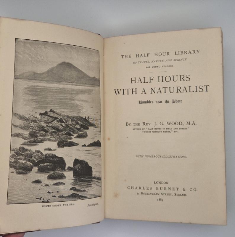 - Part of the Travel, Nature and Science Series from the Half Hour Library. Prize binding. Tree calf boards with gold decoration of three crowns to the front and delicate border. Gilt lettering and decoration to the spine. Marble end papers and marble closed page edges. Bristol Cathedral School prize plate to the inside front board dated 1893. Lightly foxed in places. No further inscriptions, 340pp. Clean pages with black and white illustrations throughout. (Any digital image available on request)