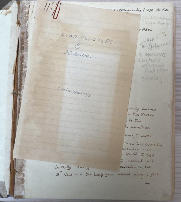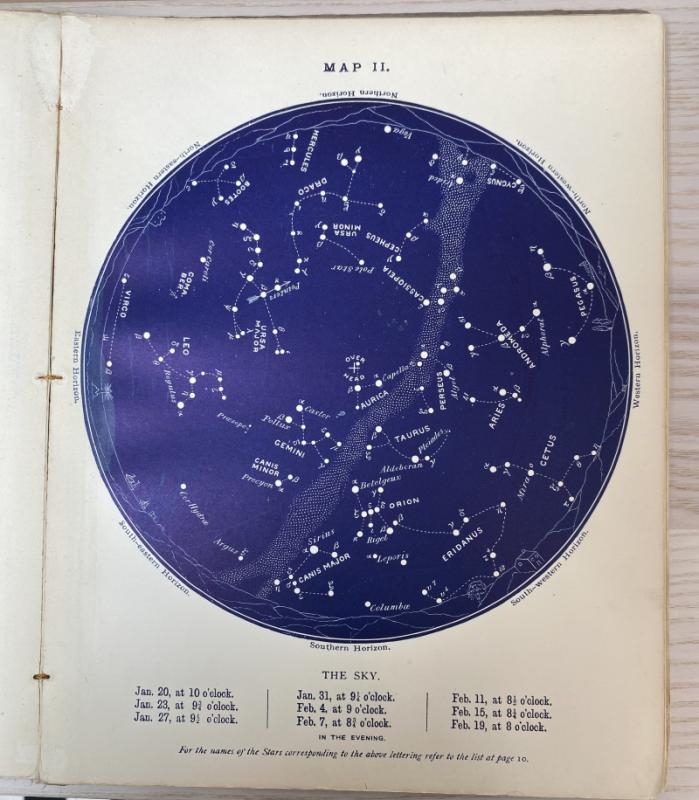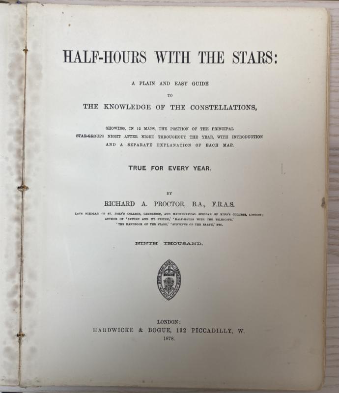 Ninth thousand. Containing twelve maps of the stars, each with introduction and explanation. Bound in quarter cloth with charming heart patterned cover design by Elizabeth Waterhouse, founder of the Yattendon Village Arts and Crafts Society and wife of Alfred Waterhouse. Rather rubbed and worn to both boards and extremities, with paper covering occ. coming away from board. 1910 newspaper clipping pasted to front pastedown, 4pp copied notes on Star Clusters & Nebulae paper clipped to ffep, with ink inscription of Elizabeth Waterhouse dated 1878 Foxhill to ffep & later 'Jingle of the Signs of the Zodiac' inscribed here in ink by MTW. Binding rather strained & tired, some handling marks and occ. spot internally. A scarce Victorian work on astronomy, this example in a lovely Arts & Crafts binding by Elizabeth Waterhouse.