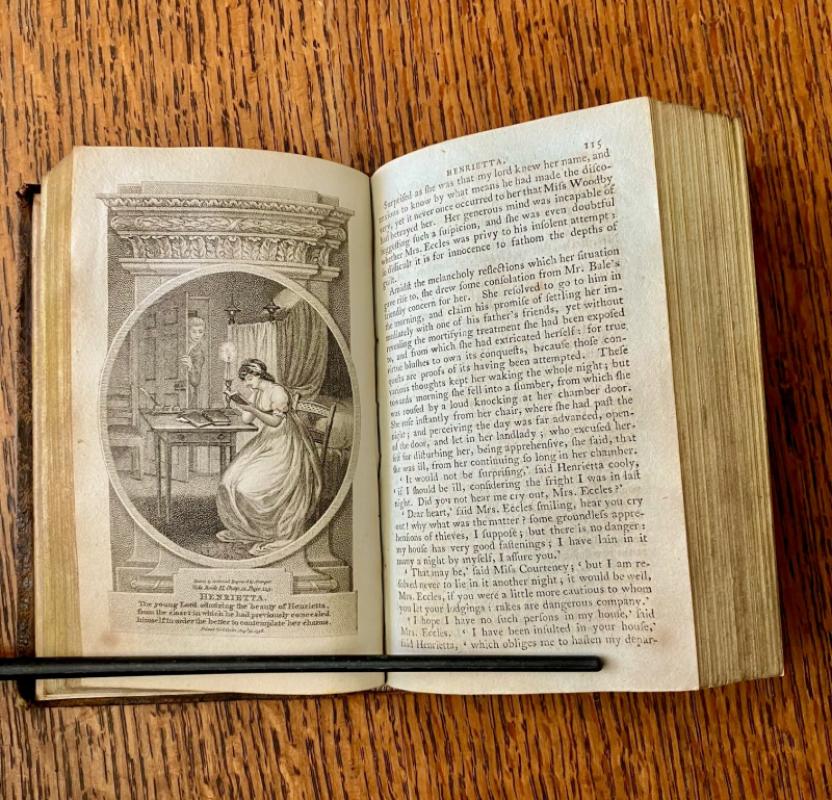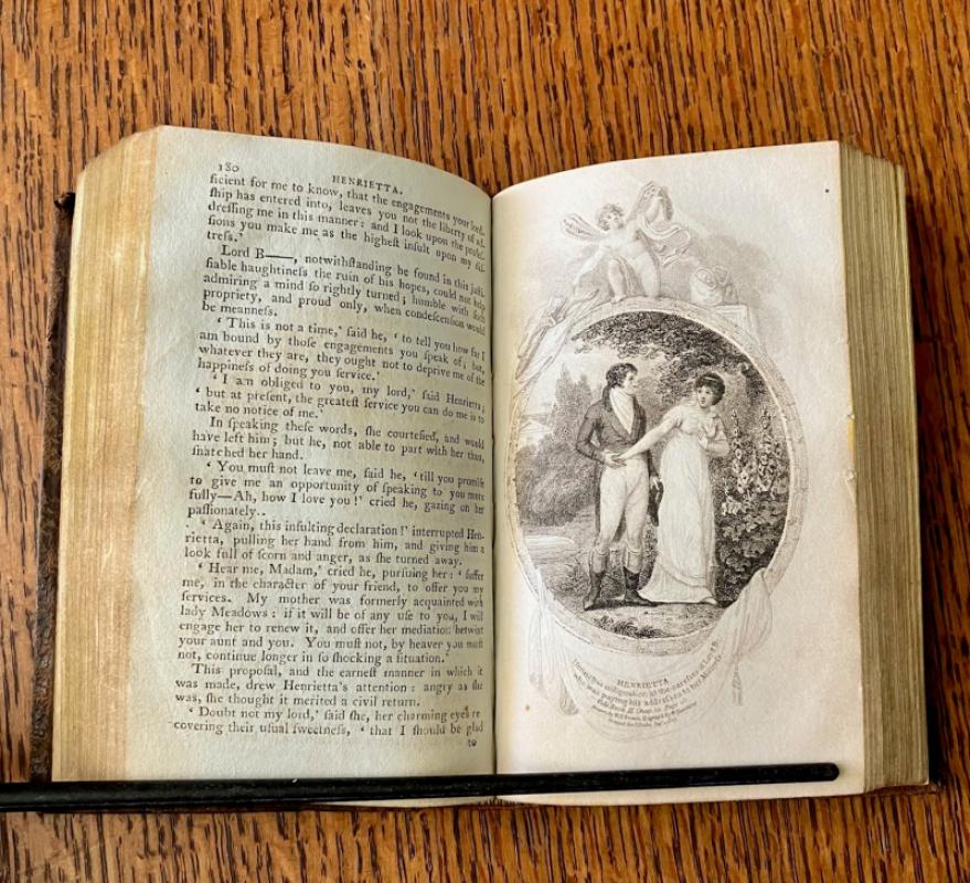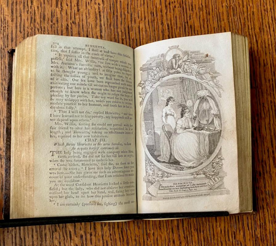 FIRST CORBOULD ILLUSTRATED EDITION. 16mo. (5.7 x 3.7 inches). 323pp. Finely illustrated with frontis and three plates, dated 1798, drawn by R. Corbould and engraved by R. Woodman, and the addition of one extra plate from a later edition, dated 1803, drawn by W. H. Brown and engraved by W. Hawkins. Previous female owner name, Agnes McNaught, dated 10th April 1816, to the top of the title page. Beautiful contemporary leather binding of full dark brown mottled calf. Spine with ruled lines and decorated in gilt. Red title label, gilt. One page with small amount of loss to the bottom outer corner, but not affecting the text, and a couple of leaves with some minor spotting but overall a clean copy in an attractive early binding, with a little rubbing to the edges but overall in very good condition. --- Originally published in 1758, Henrietta is an interesting commentary about the lives, and how much control they were allowed over their own destinies, of women in 18th century society. It is a scarce title in any 18th century edition.
