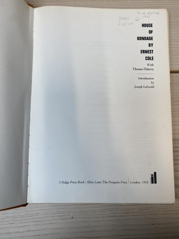 A UK first edition of Cole's photographic exploration of the experience of Black people during South Africa's Apartheid. Publisher's orange cloth in a clipped dust wrapper. Minor bumping to the extremities and the head and tail of the spine to both book and wrapper, light wear to the edges of the book. Illustrated with black and white photographs throughout. A smart example.