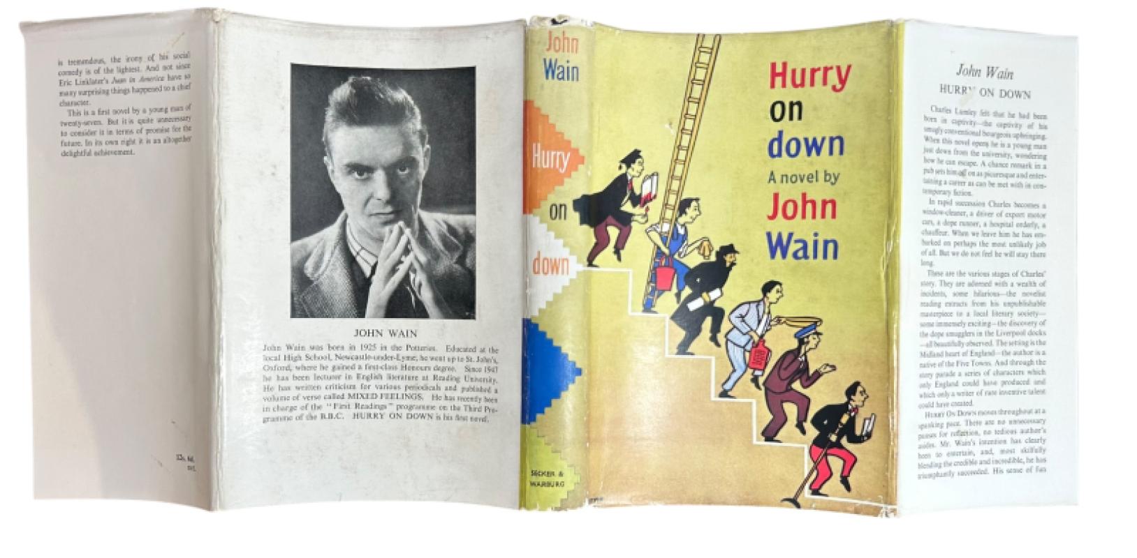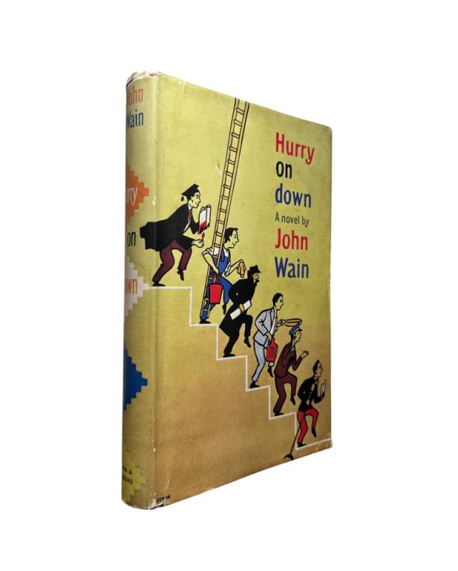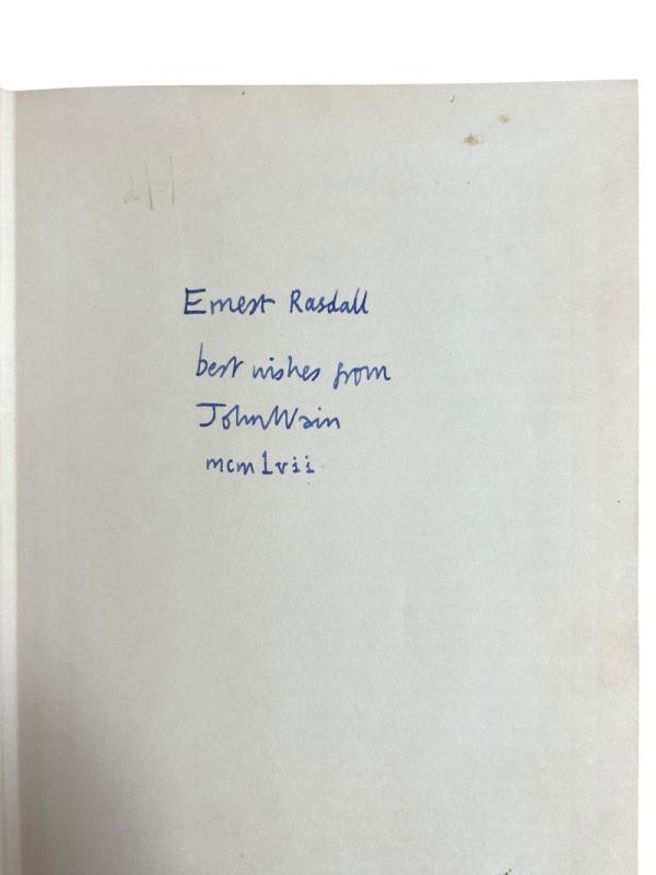 London: Secker & Warburg, 1953. First edition, first printing. This is a very good copy. In the exceptional dust jacket, depicting Charles Lumley’s numerous careers as he descends the social ladder. Light handling marks throughout, and some mild wear at the corners and spine tips. It has not been price clipped (12s. 6d. net). One bump at the edge which translates to the boards. The boards are, bump aside, clean in the publishers red cloth. The text blocks are notably clean. There is some slight tape residue to the rear endpapers. The author, John Wain, inscribes this copy: ‘Ernest Randall | best wishes from | John Wain | mcmlvii’ in blue ink. Overall, this is a very good copy of a scarce signed title.