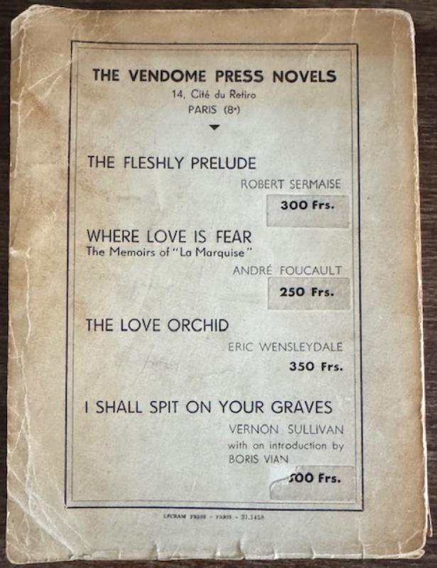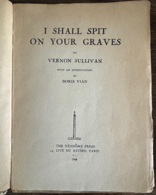 Vian, Boris (under the pseudonym Vernon Sullivan). I shall spit on your graves. With an introduction by Boris Vian. - ADDED: the original French edition J'irai cracher sur vos tombes (1946). Paris, The Vendôme Press, 1948, 201,(1) pag., original wrappers, untrimmed