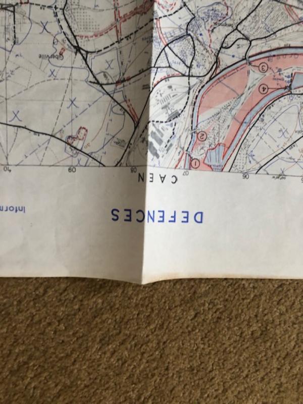 This Map is dated May 1944 (information at May 44)and has the Defence Overprint key on the rear of the Map, this explains the defence detail printed on the front of the map. size c.70cms x 50 cms with "Top Secret until issued for briefing ground troops thereafter Secret". Unusually an Original contemporary aerial photograph of Caen with detailed key of important Military installations etc., is included. In combination these make a unique piece of Normandy invasion history. Both are in very good condition apart from modest marks to rear of map, consistent with use and both items are folded.