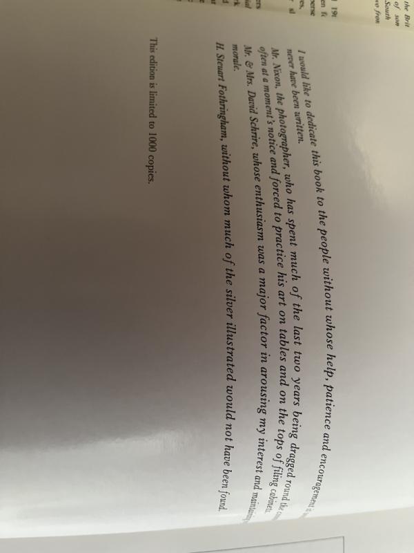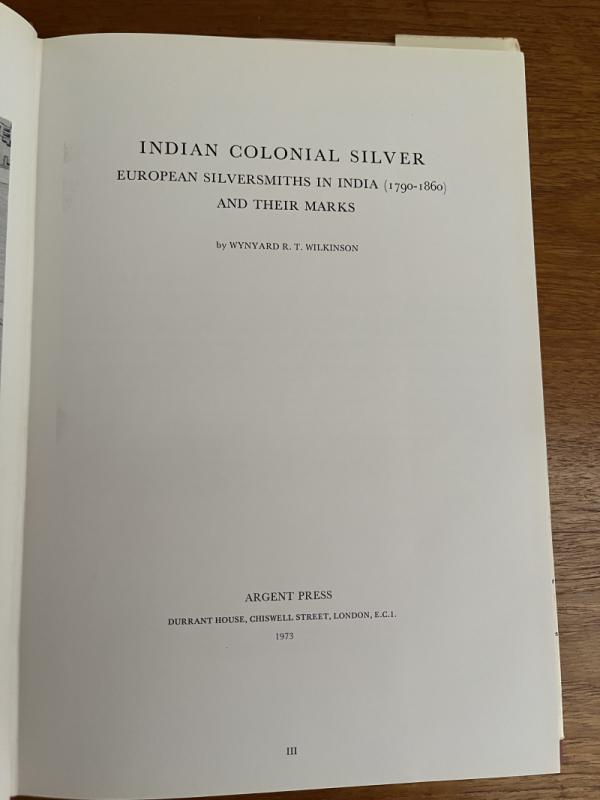 ‘Indian Colonial Silver - European Silversmiths In India (1790-1860) And Their Marks’ ~ by Wynyard RT Wilkinson; pub by Argent Press, London 1973. Limited Edition to 1000 copies. with ream paper jacket. A4 - 8 ½” x 12”, 180pps with an abundance of b&w photos & illustr; jacket has just a few marks and some slight wear on corners, book is in excellent condition.