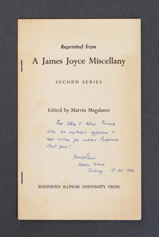 Stern’s memoir of Joyce was first published in Marvin Magalaner (ed.), A Joyce Miscellany, Second Series (Carbondale, IL: Southern Illinois University Press, 1959), and this first separate edition is an offprint from that volume, titled on the upper wrapper ‘Reprinted from / A Joyce Miscellany / Second Series / Edited by Marvin Magalaner’. This separate edition retains the volume’s original pagination and was apparently printed from the same type (the erroneous ‘night’ for ‘might’ at l. 23 of p. 95 is present in both the volume and offprint issues). It was later published in the periodicals The Listener (28 September 1961) and The Irish Digest (December 1961). ¶¶