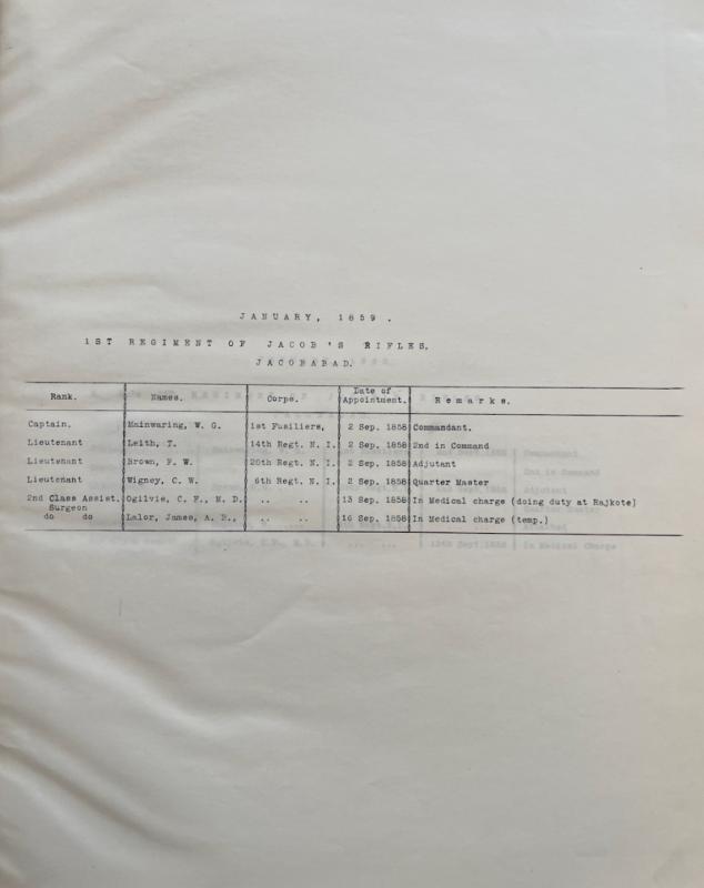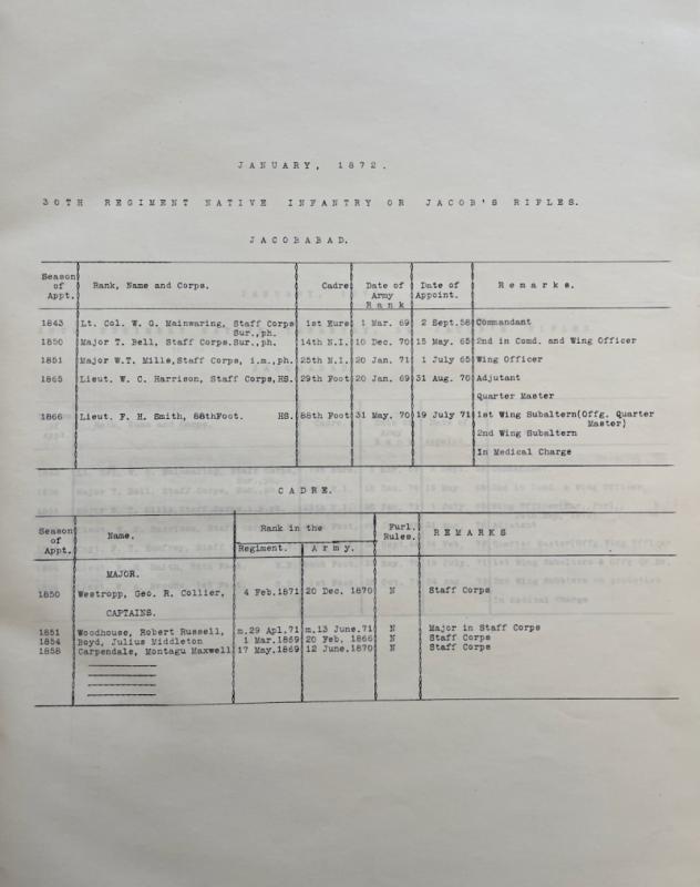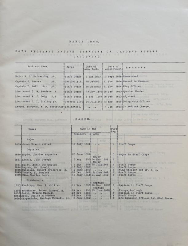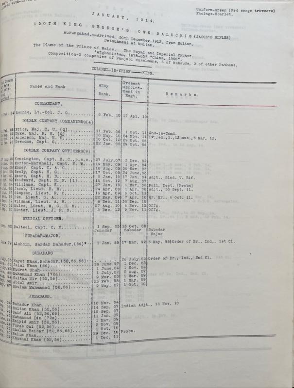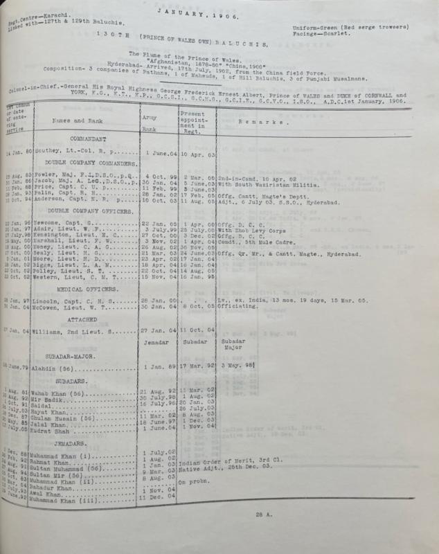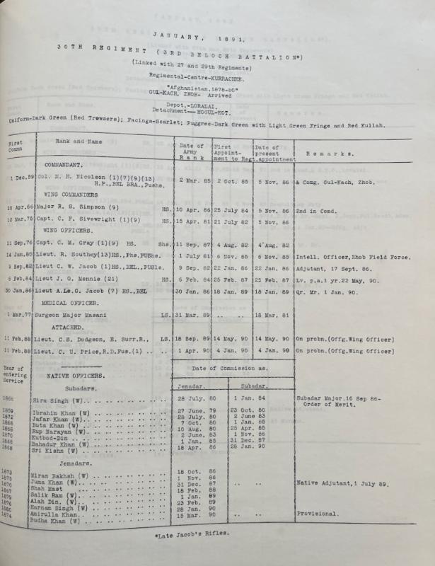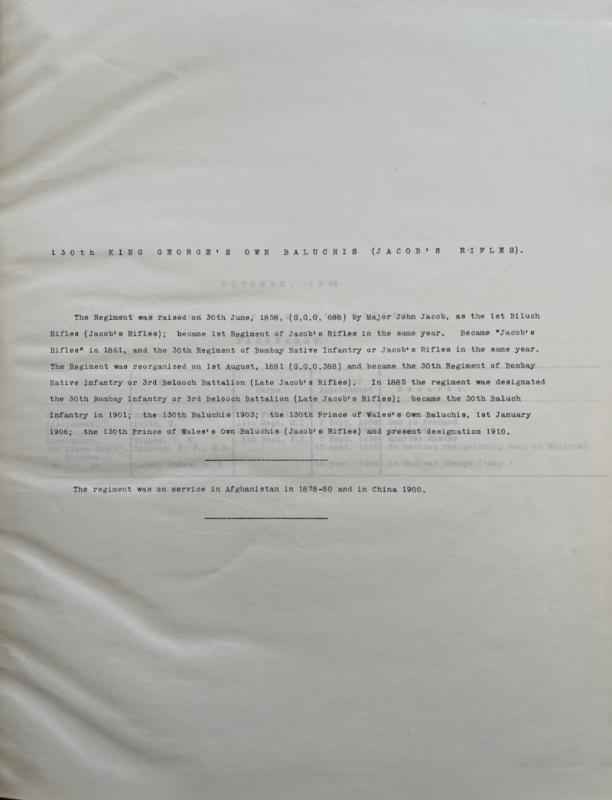 A typescript copy of the muster roll for this regiment from its raising by Major Jacob in 1858 as the 1st Biluch Rifles (Jacob’s Rifles) through its various designation changes: 30th Regiment of Bombay Native Infantry or 3rd Belooch Battalion, 30th Bombay Infantry, 30th Baluch Infantry, 130th Baluchis, 130th Prince of Wales’s Own Baluchis to 130th King George’s Own Baluchis. The regiment served in the 2nd Afghan War [1778 - 80], suffering heavy casualties, and was sent to China to suppress the Boxer rebellion in 1900.
