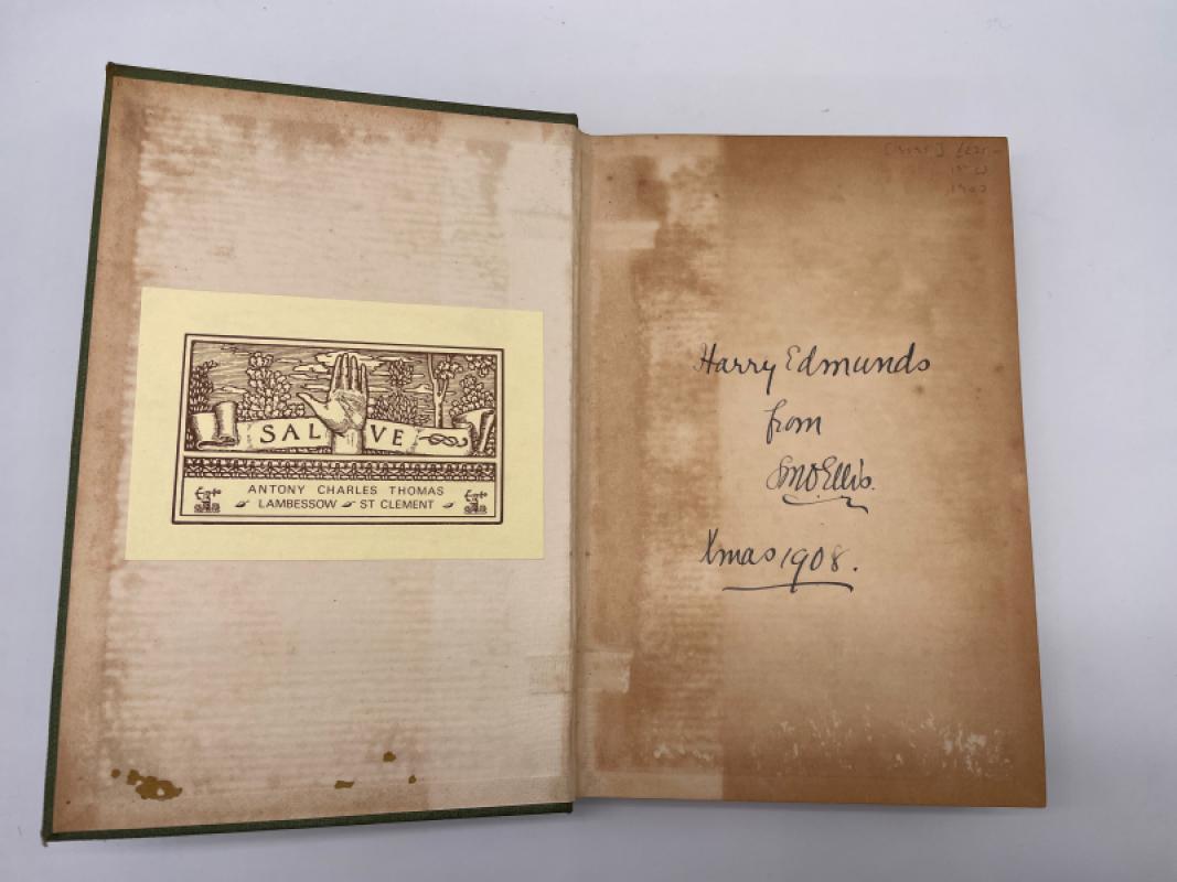 FIRST EDITION, INSCRIBED BY AUTHOR. 8vo, title page printed in red and black. Original green linen, paper label to spine, lettered in black, ruled in red. Gently rubbed, traces of paper label and a few marks to upper board. Edges foxed and browned. Endpapers heavily and unevenly browned, a few chips (former insect damage?), Anthony Charles Thomas’ illustrated ex libris to front pastedown, inscribed by Ellis in sepia pen to ffep: “Harry Edmunds, from EMO Ellis, Xmas 1908”. Foxed, else, clean and tidy. JiscLHD locates four copies only (BL, Bodleian, CambridgeUL & NLS). Unusual.