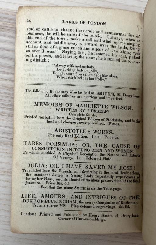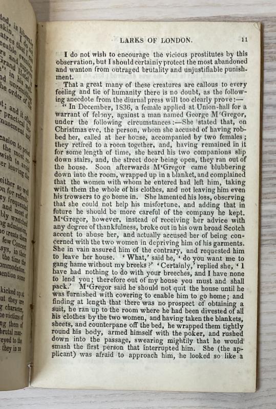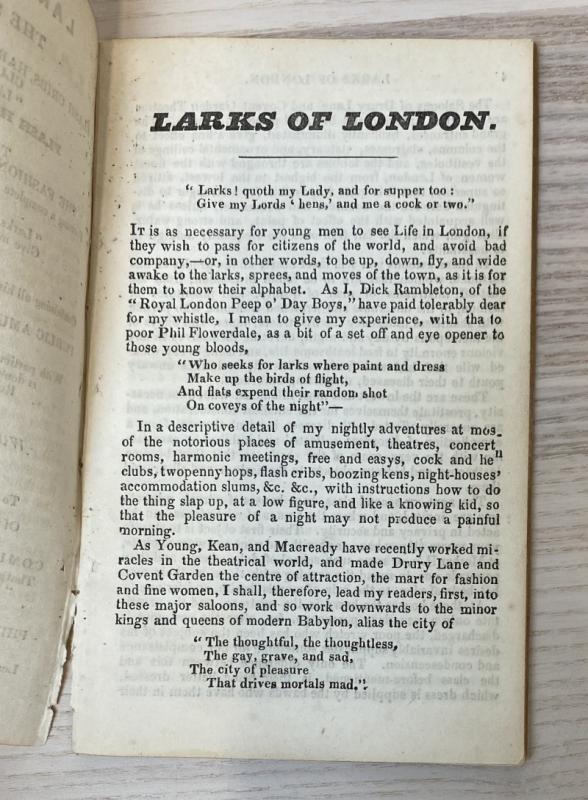 Published anonymously under the pseudonym Dick Rambleton. Without the folding frontispiece illustration. Publisher's wrap intact to rear, else unbound; title page starting to come away at the bottom of the textblock, else smart with just light edgewear to the leaves. Only three known extant copy, this being an unrecorded publication: one of the surviving examples is from the collection of Madeline Kripke, documented in a 2013 article - this copy was left in Kripke's will to the Lilly Library. A very rare and unrecorded pamphlet on London night life in the early to mid 19th century, documenting 'flash crimes, harmonic meetings, cock and hen clubs, night-houses, little goes, big goes, flash houses and seducing houses'.