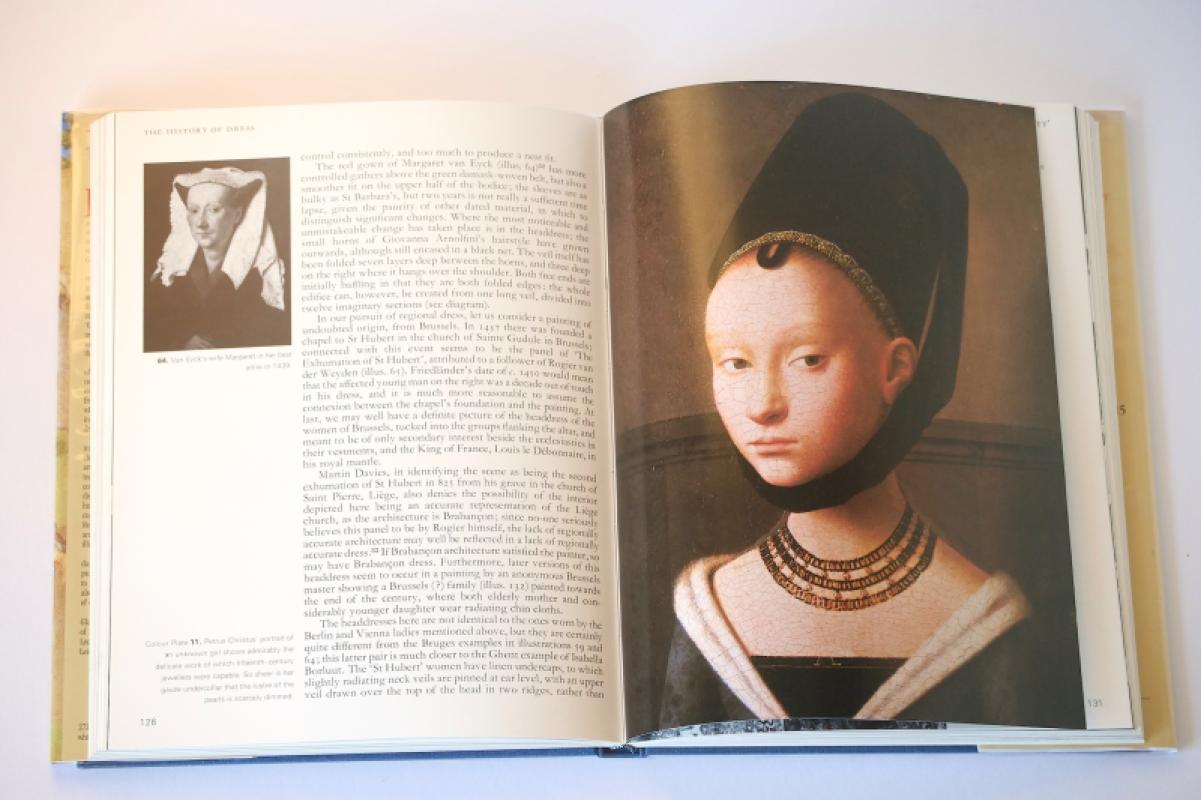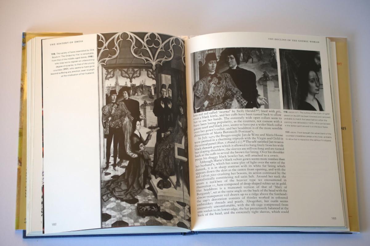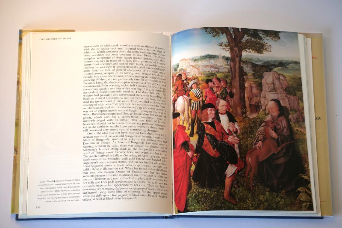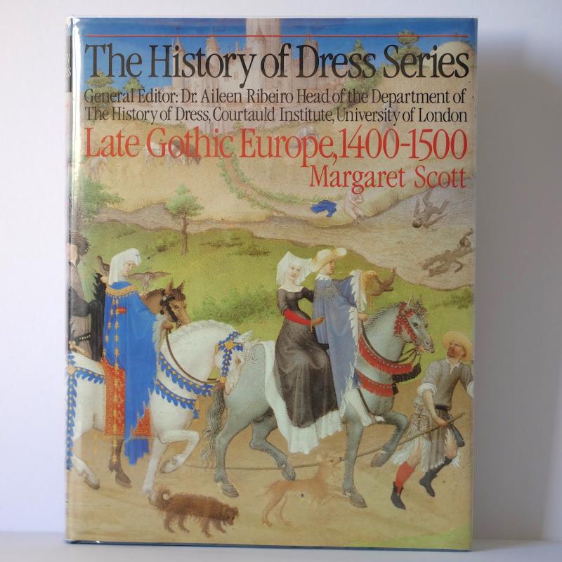 A fascinating book in excellent condition, no markings to the text, just a few small spots along the outer top edge of the pages, the blue boards bright and solid, with only the faintest trace of rubbing here and there. The dust jacket, now in a smart protective sleeve, has a few minor signs of shelfwear and handling. For example, the top of the spine is rubbed, there's four small spots of white below, and the top front outer corner is very lightly rubbed and creased. Includes 169 black and white illustrations, and 17 mostly full-page colour plates. In these Margaret Scott points out details that provoke reveries of curiosity. For example, in plate 16, the last one featured in the photos included here, she notes "several depictions of how men deliberately made their dress appear untidy in the 1490s, mainly by wrapping their gown sleeve round their arms several times and not having the sleeves completely joined to the gown at the armholes." Why? Well, as she also notes, "Dress is the most immediate and silent form of expression for prevailing moods in a society, and consequently the most difficult to understand afterwards." But she has a tremendous go at doing so. There's page after page of intriguing displays of knowledge and looking. The looking is important - just as it is (it feels right to say here) at a PBFA book fair! "See what your own eyes can tell you" is the message that Scott says she most wants to get over. Her book is highly recommended.