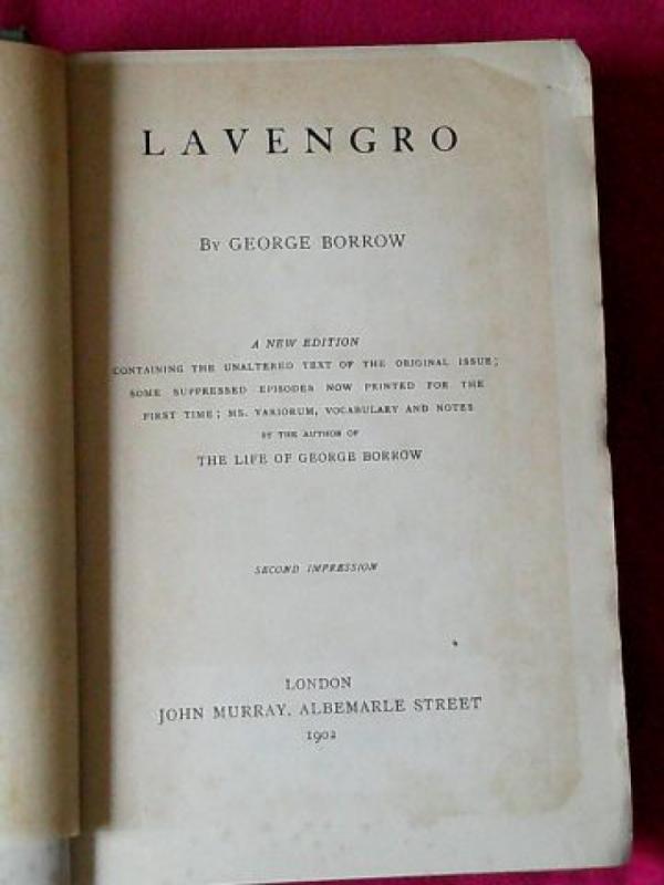 B/w. frontis. photograph of the author from a portrait by R. Phillips, titles; preface; lists of chapters & illustrations; 'Lavengro' falls somewhere between the genres of memoir and novel & Borrow originally intended the book to be an autobiography. Its protagonist, whose name is George, is born the son of an officer in a militia regiment and is brought up in various barrack towns in England, Scotland and Ireland. After serving an apprenticeship to a lawyer he moves to London and becomes a Grub Street hack, an occupation which gives him ample opportunities to observe London low-life. Finally he takes to the road as a tinker. At various points through the book he associates with Romany travellers, of whom he gives memorable and generally sympathetic pen-portraits.