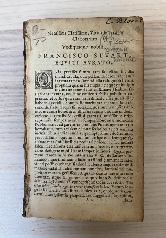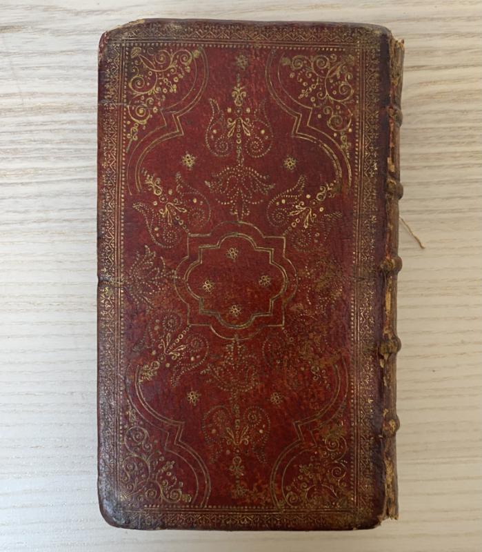 Full calf fine binding attributed to Le Gascon, with his signature finely gilt design. Front board loose but present, with minor bumping to spine ends resulting in loss, extremities similarly bruised resulting in light losses. All edges gilt, marbled endpapers. Lacking title page, blanks & frontispiece; first leaf being A2. Ownership inscription to first present leaf, the work appearing complete bar title & prelims. Minor age-toning to margins. A delightful mid 17th century pocket binding of Lucan's Pharsalia, with the binding attributed to Le Gascon.