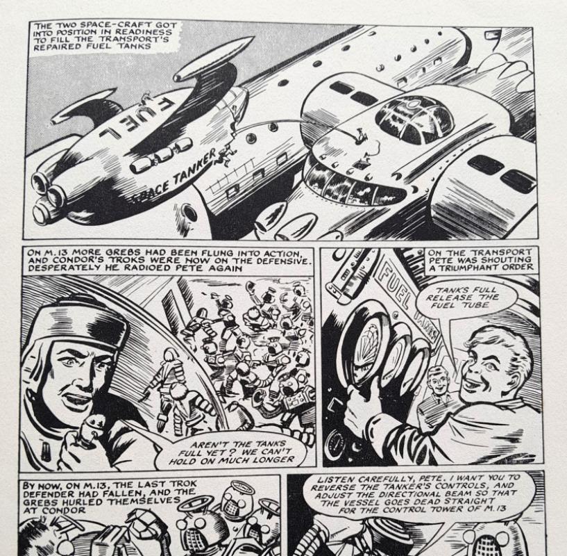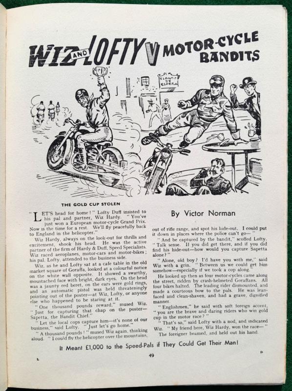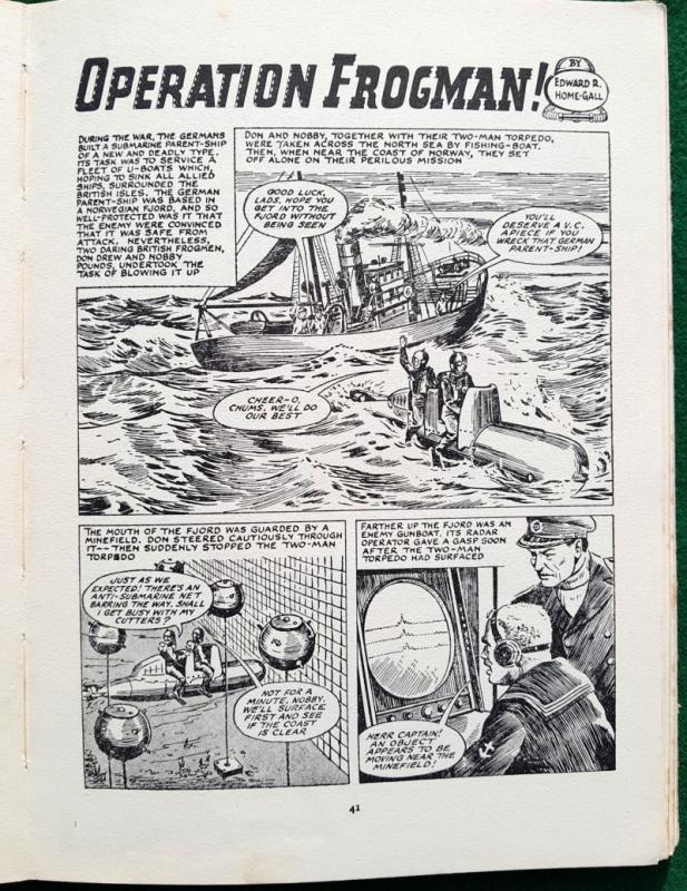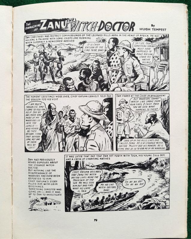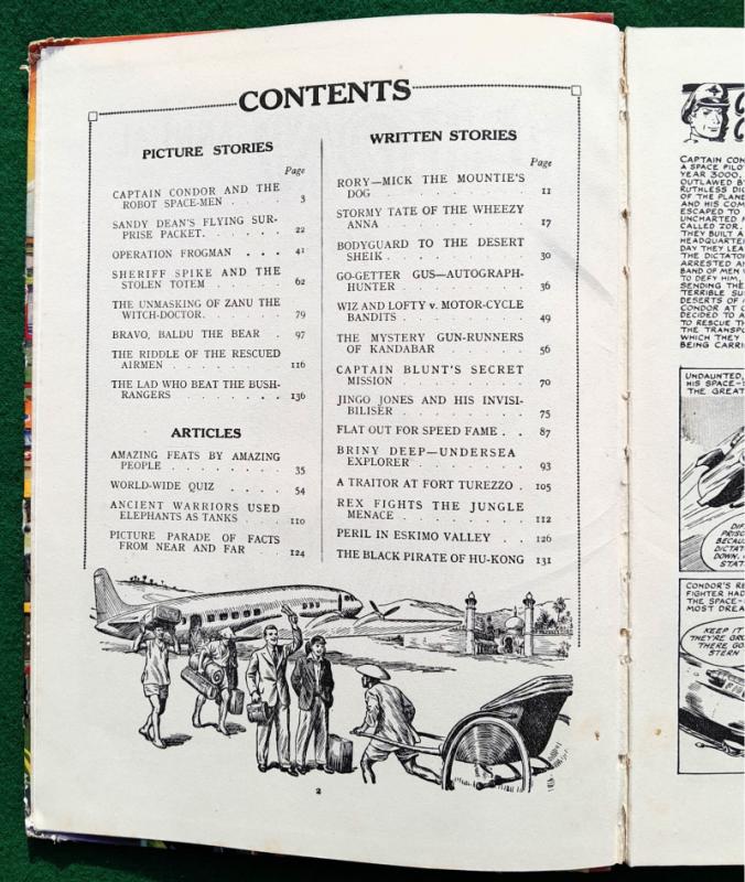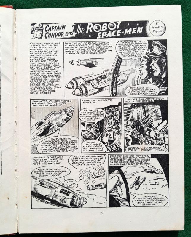 Colour frontispiece, picture strips and illustrations in b/w throughout. Captain Condor and the Robot Space-men by Frank S Pepper, Zanu The Witch Doctor by Hugh Tempest, The Black Pirate of Hu-Kong by Edwin Dale and many more adventure stories and articles. 144 pages. Occasional marks at page edges, contents very good, not price clipped. 275 x 200mm [approx. 10 ¾” x 8”] cloth spine, pictorial boards; some rubbing and grazing, tips worn, very god and bright. Amalgamated Press Ltd 1st edition 1955
