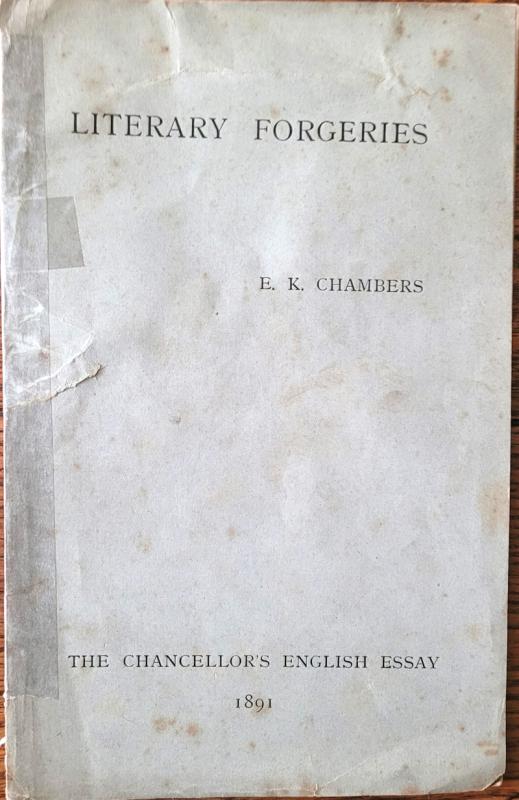 Literary Forgeries, The Chancellor's English Essay, by E[dmund] K[erchever] Chambers, pub. Blackwell, Oxford, 1891. Chambers [1866-1954] was a literary critic and scholar of Medieval and Tudor drama. This is a rare first edition of his prize-winning essay, published here in the original 37-page pamphlet. The front cover was reattached at some point in the past with conservation tape. The covers have touches of creasing, grubbiness and foxing, and, in addition, the front cover has a short, closed tear, but this is a vanishingly rare item of interest considering Chamber's distinguished later career as a critic. He covers a good deal of ground, from Classical Antiquity to Chatterton and MacPherson, as well as mentioning some lesser-known examples of literary forgery, all the while putting them into a historical and psychological context. Of added interest, this copy bears the bookplate to the inside of the front cover of 'Kinn Hamilton McIntosh', who wrote a series of successful crime novels under the pseudonym of 'Catherine Aird'