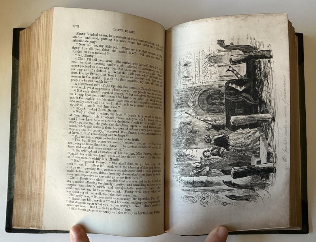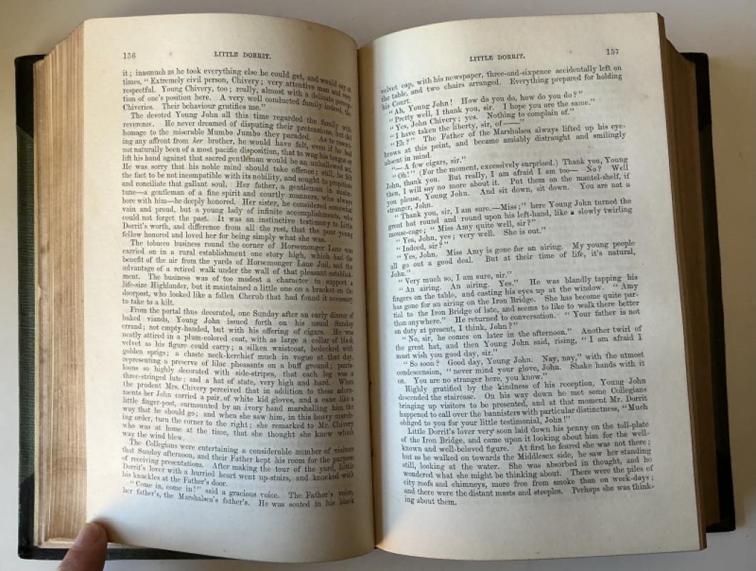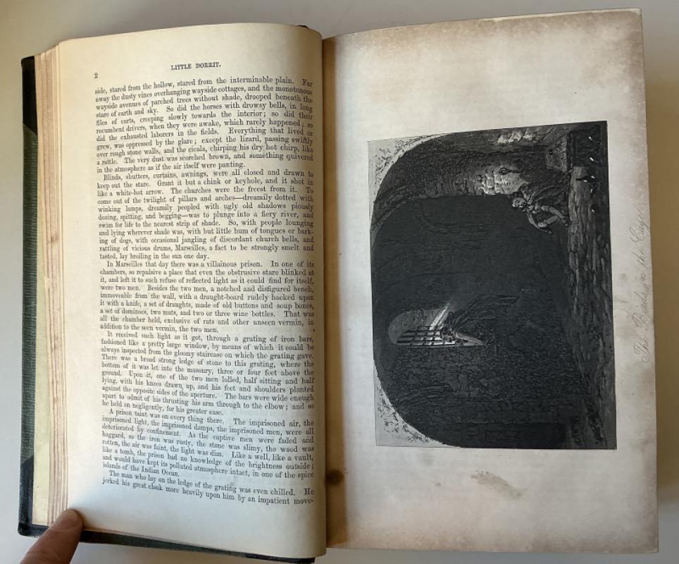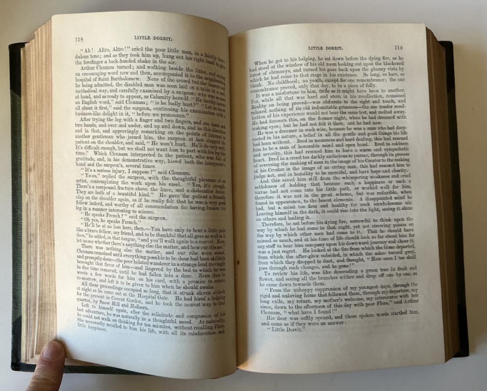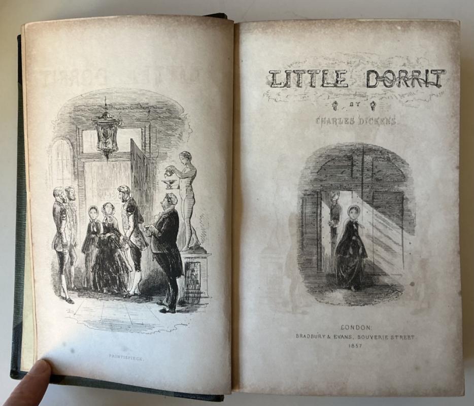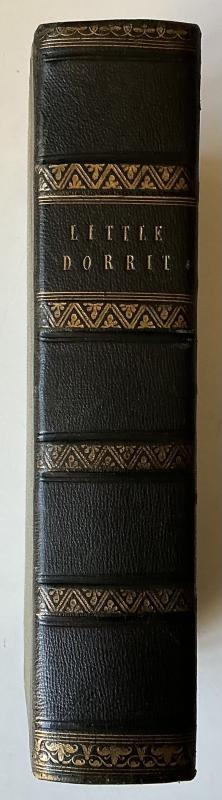 First edition. Bound from the parts. Collated complete and correct. Pp xiv, 625. Engraved title page, frontis and plates by Phiz (H K Browne) present as listed (including the so-called dark plates). Contemporary half morocco gilt with raised bands, on green cloth boards, pale yellow endpapers, all edges gilt. Small binder's mark "JEFFERIES, BINDER, ANGEL CT, SKINNER ST, [?] B. G." to top front pastedown. (Presumably the B.G stands for Bishopsgate). A very little foxing or toning to plates, very clean text, bright binding. Textual points: Rigaud instead of Blandois to Chapter SV (indicating the earlier issue). Other indications of early textual state: Fidgetty to page 265, Diceing to page 360, signature is B2 on page 371 (see Smith Vol 1 91-95).