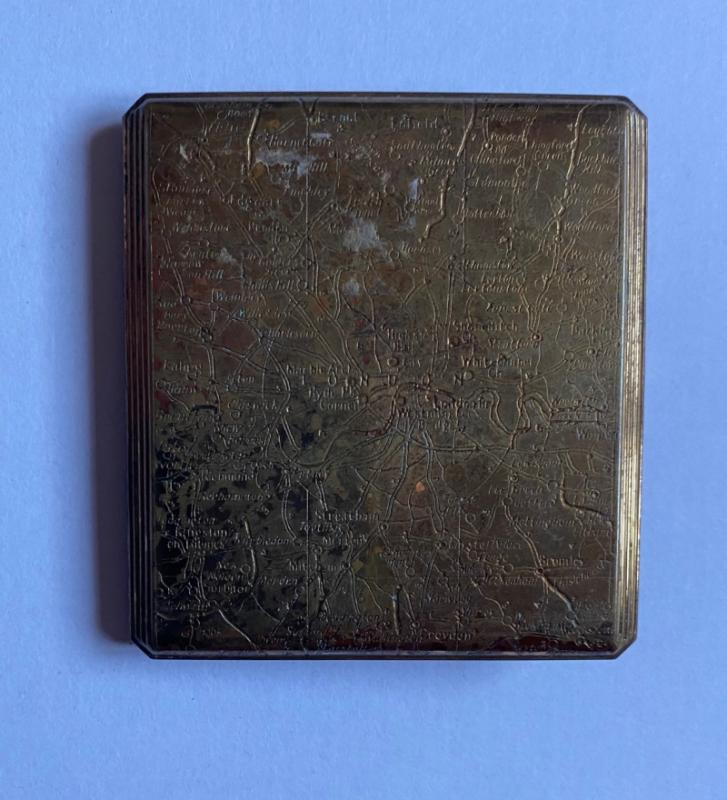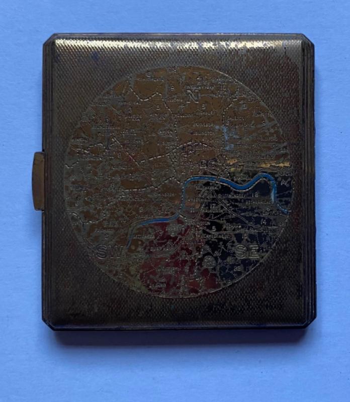 London Tube map Cigarette Case 1930s. A small gold plated brass case with three London maps: a map of the London Underground on the inside and two other maps on the front and back. These are a circular map of London showing the old postal areas (NW, NE, SW and SE) with the suburban codes also shown within these areas, plus a map of outer London from Enfield south to Croydon. The Underground map is based on the classic Harry Beck style. Age wear to both of the outside maps and a few small spots to the tube map. Possibly produced in the late 1930s and similar to one held in the collection of the London Transport Museum. Fair to Good condition with the qualifications above.
