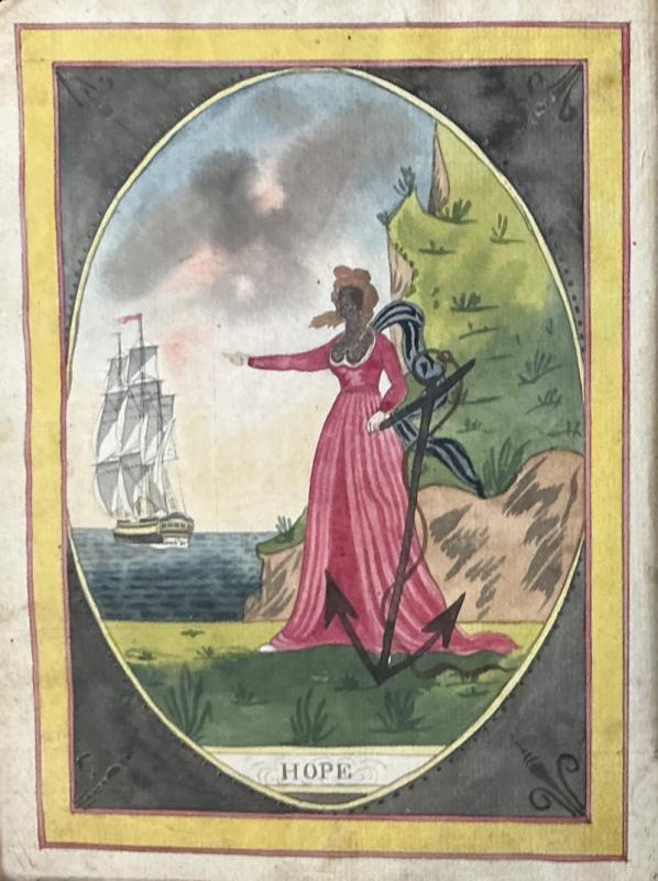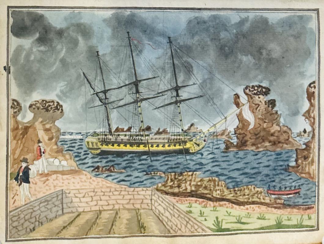 [ McALISTER, James] Manuscript navigation exercises circa 1799-1804. Bound in the original quarter calf with sponged paper covered boards with the remains of tape ties. Approx 18.5 cm x14.5 cm x 2.5 cm. With three wonderfully naïve full-page watercolours on a naval theme. Approx 192 pages written in a tidy, readable hand in ink illustrated with compass bearing diagrams, charts, mathematical calculation etc. Clues to the authorship of the work lie in a scrawled pencil letter in French signed L N McAlister, and in a title page to one section of the work “ A Journal of a Voyage from the Lizard to Madeira and Teneriffe kept by Ja.s McAlister out of John Hamilton Moore’s Epitome”. This is not an actual account of a voyage, but an exercise undertaken by all trainee Midshipmen. James has used the format given in Hamilton Moore’s Epitome to write up a fictitious voyage as part of his training. We found among the Greenwich Pensioners for the Royal Navy and Marines a James McAllister who served for 16 years and had a pension granted to him. His last ship was named the Caledonian, no others recorded. He died on 27th December 1817 and it said that any outstanding money was paid to his brother Archibald. It seems likely that he was the Archibald McAllister who also had a Royal Navy pension. He died on 28th December 1856 at the age of 78. The journal seems to have been written around 1804, - Nelson’s Navy- at a time when there were a large number of casualties, injured officers and pensions awarded. It seems entirely plausible that James McAlister entered service around 1804, and was pensioned off in subsequent years, perhaps meeting an early death because of injury, illness or disease. This is speculation, but there are no other names to help with a definitive attribution. A good example of an earlyMidshipman’s training log with delightful illustrations.