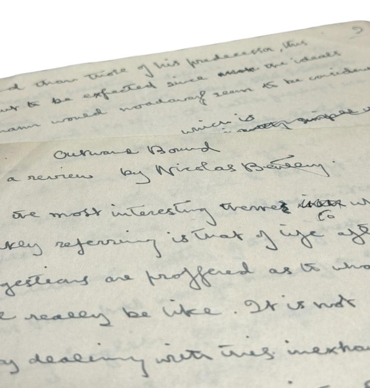 235x185mm. Four sheets, single sided. Undated, but circa 1923. Written entirely in Bentley’s hand in black ink. Titled ‘Outward Bound a review by Nicholas Bentley’. An apparently contemporary manuscript review, written by Bentley when he was just 16 and a student at University College School, Hampstead. The play opened at Everyman Theatre, Hampstead, on September 17th 1923.