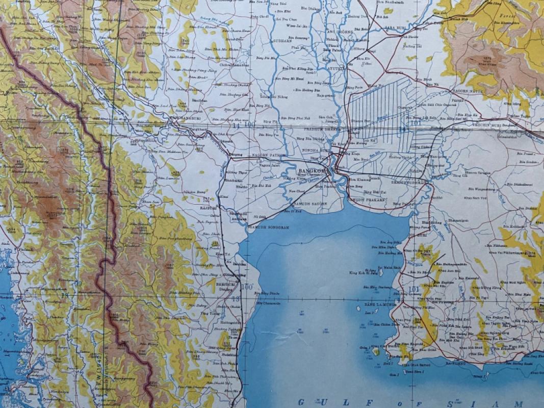 Map of Bangkok . Published by the US Army as part of a series of International Maps of the World 1942 coded ND-47 and marked “for official use only”. On paper size 68 by 52 cm. Scale 1;1,000,000. The map includes part of the coast of Burma.