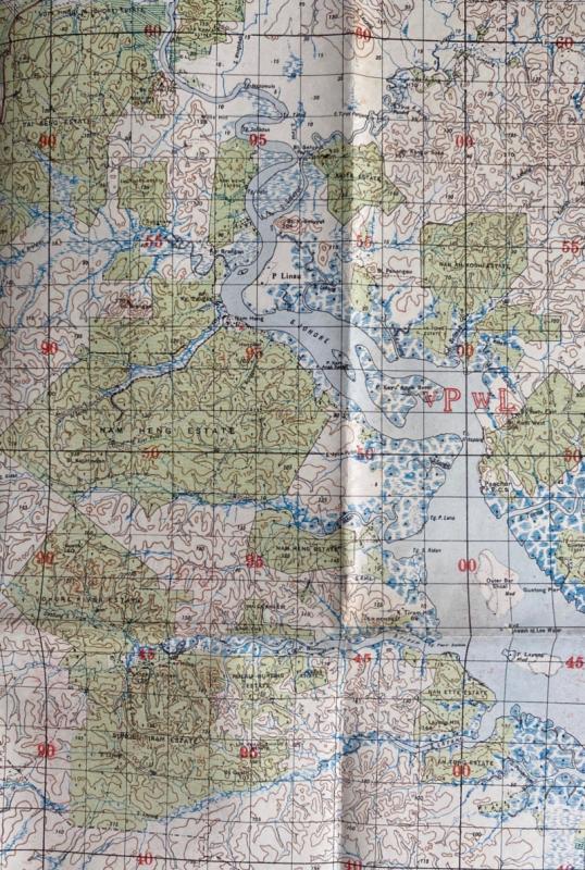 Map of Johore 1944. Johore, published by the Survey of India, Calcutta for the British War Office 1944. 2nd edition. On paper size 69 by 51 cm. Scale one inch to the mile. With two keys, one to geographical features including railways (built and under construction); roads; canals; wells; cart tracks; bridle paths; footpaths; mineral and telegraph lines etc., and the other a key to buildings and features such as churches; mosques; Chinese and Hindu temples; Buddhist temples; mines; deserted villages; forest bungalows; hospitals; schools; police and customs stations etc. Below the map is a glossary of terms used in English and Malay. Colour. Heights are shown by colour and contours. Has been folded. A detailed map in VG condition