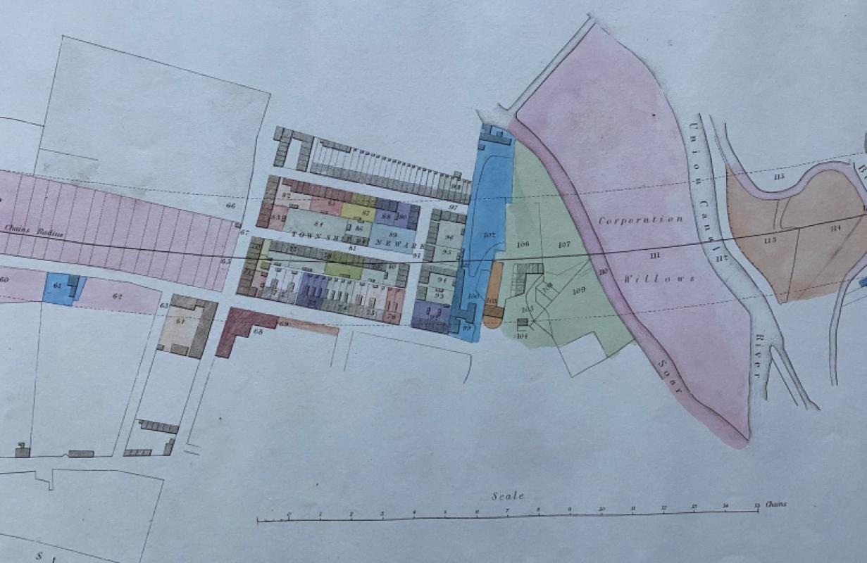 Map of Leicester, including the County House of Correction, Braunston Gate and Great Holme Street with the River Soar and the Great Union Canal, an enlarged plan on a scale of 2 chains to the inch or 42 inches to the mile. Size 73 by 43 cm. On good quality paper. One of a series of plans and sections for a London to Manchester Railway by Rennie, Rastrick and Remington printed and published by Arrowsmith 1845. Some hand colouring. A detailed map that is possibly on a larger scale than any Ordnance Survey map of the period. VG condition.