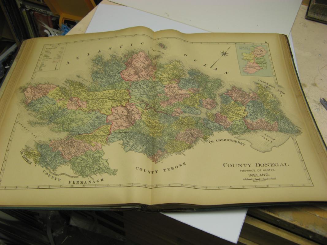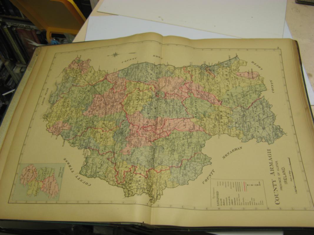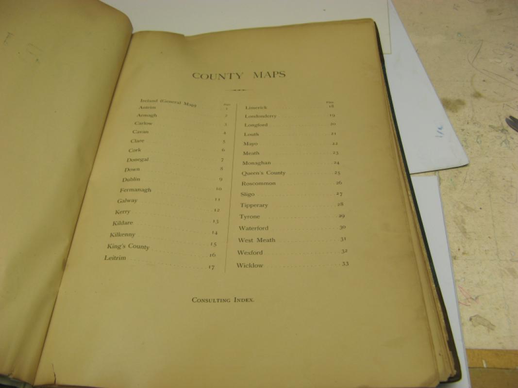 This product is a large leather-bound atlas of Ireland by Richards, published in 1901. It contains 33 illustrated maps and is considered a first edition. The atlas covers a range of non-fiction topics related to the environment, nature, and earth, making it a valuable collectable for those interested in historical cartography.L RICHARDS LARGE FOLIO MEMORIAL ATLAS OF IRELAND COMPLETE WITH 33 MAPS OF EACH COUNTY C1901 RECENTLY REBOUND TO HIGH STANDARD INTERNALLY MAPS GOOD/VGC A COUPLE OF TINY TEARS TO MARGINS ONLY .BOOK LARGE FOLIO BOARD SLIGHTLY WARPED 540MM X 420MM MAPS DOUBLE FOLIO 740MM X 540MM ,A SCARCE ATLAS COMPLETE