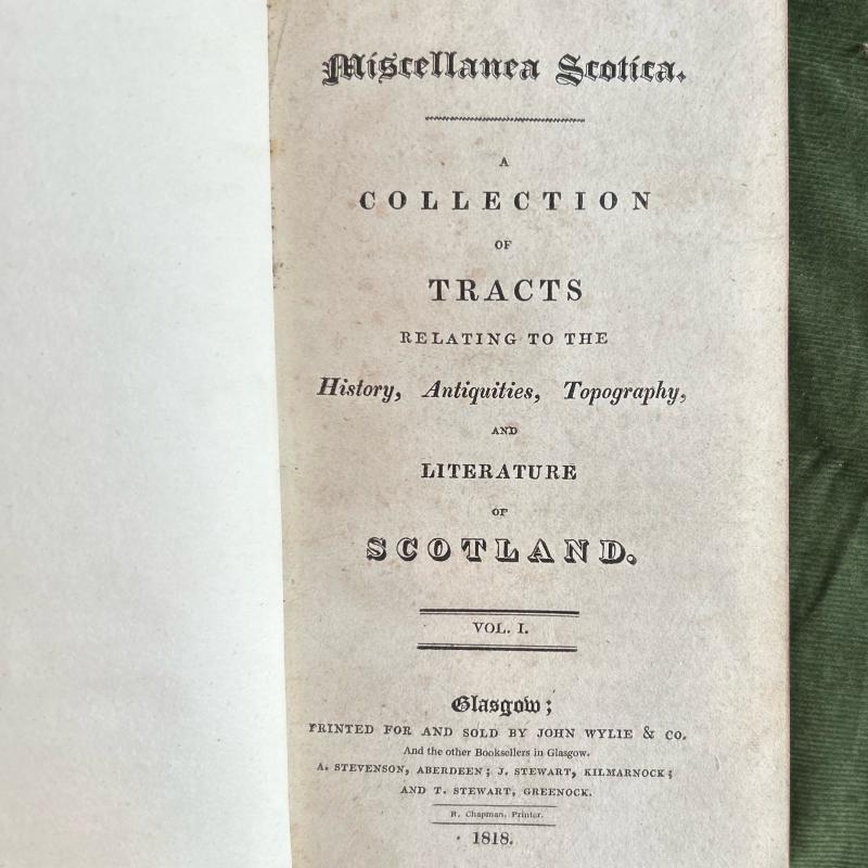 A very smart four volume leather-bound set of Glasgow publisher John Wylie and Company’s Miscellanea Scotia, a collection of reprinted earlier works on various aspects of Scottish life and history. Contents include travelogues, a history of the Picts, narratives of the Glencoe massacre, treatises on Second Sight, and various clan histories. These first edition copies, published between 1818-1820, have been rebound from their original cloth in handsome leather boards with raised bands and gilt title plates to the spine.