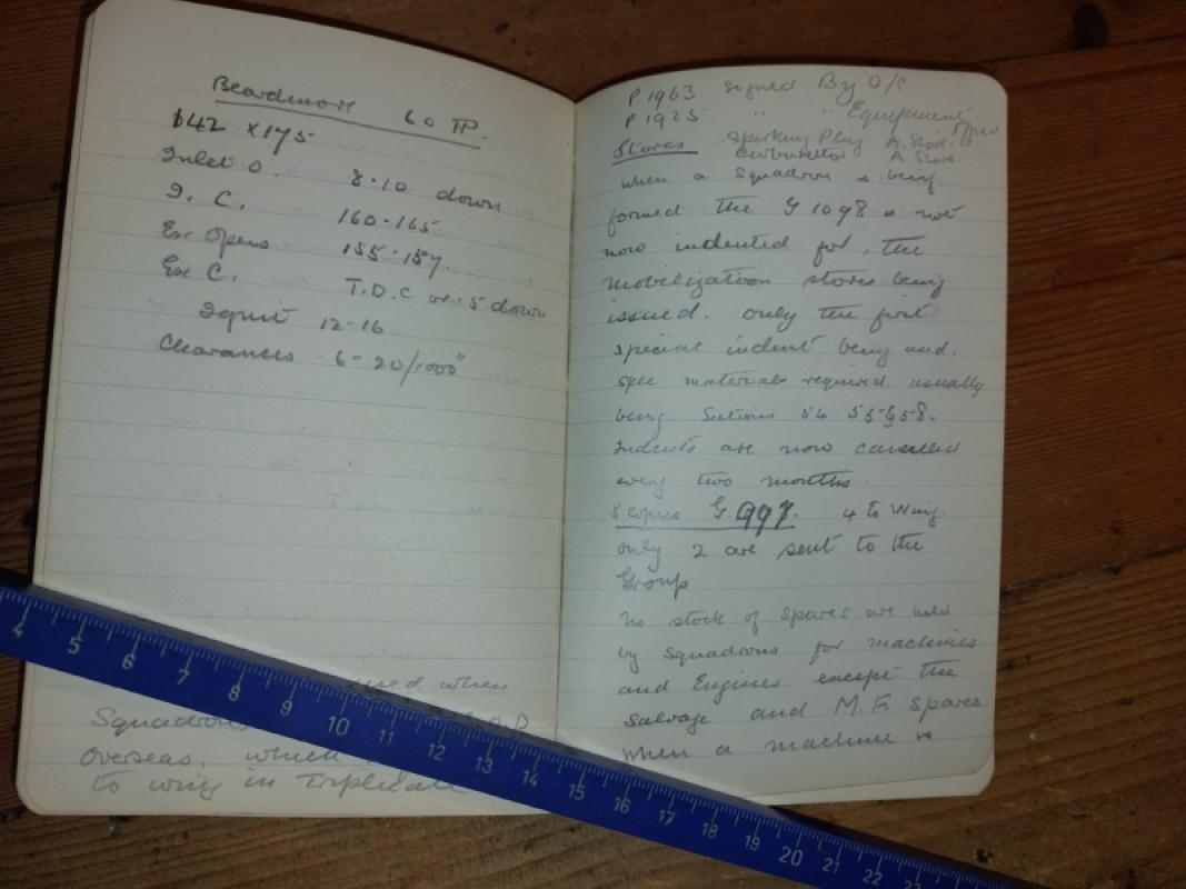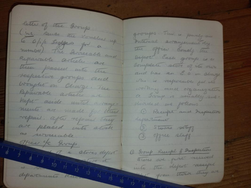 WWI notebook 6 1/2'' of Hilary John Lloyd Greatwich comprising 240pp of pencil notes detailing the management, distribution and content of stores of the Royal Flying Corps at their depots dated Aug 27, 1917 to Oct 25th 1917 with some technical drawings. b. 18.10.1890 at Bridgnorth, Salop, Greatwich was educated at King Charles I Grammar School, Kidderminster. Enlisted Aug. 1914 appointed to Royal Flying Corps as motorcyclist at Farnborough then No. 1 Squadron, Brooklands. Gave lectures to troops promoted to Sergeant served in France Mar 1915-Jan 1916. Appointed temp. Sergeant Major served in France Dec 1916-Aug 1917. Appointed temp. 2nd Lieutenant Aug 1917 working at Regents Park Stores. Left RAF Apr. 1919 as acting Captain.