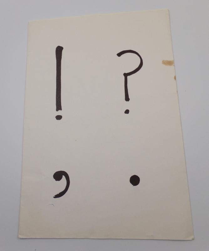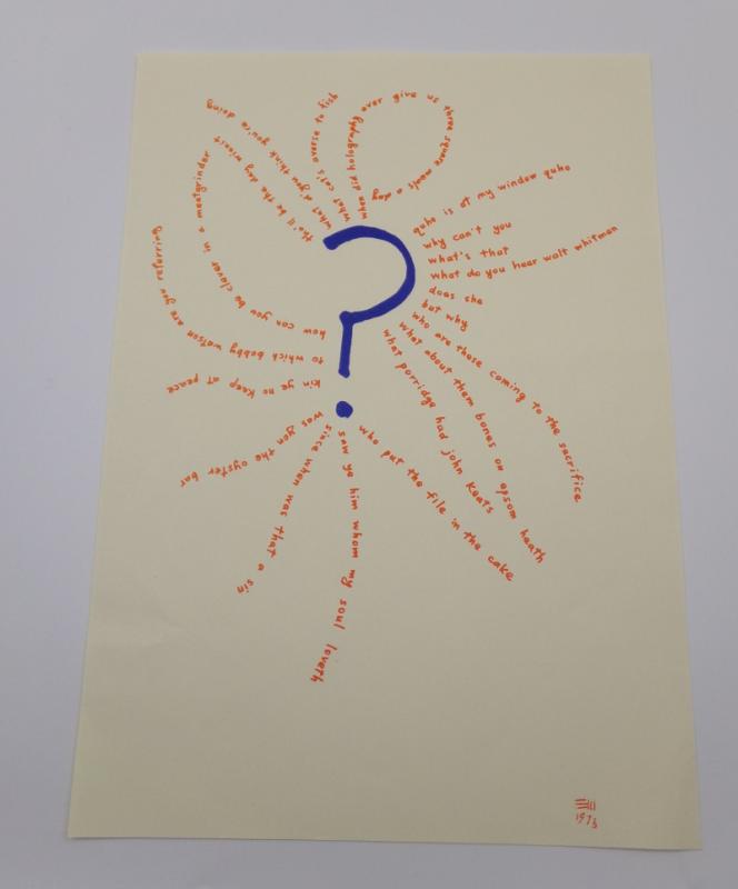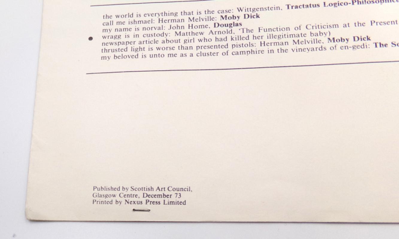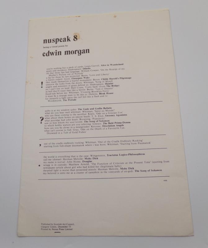 Edwin Morgan. Nuspeak 8, being a visual poem. Glasgow: Scottish Arts Council, December 1973. Stapled card folder containing 4 loose sheets, each 295mm x 210mm; one sheet for each punctuation point. Folder has some staining on front and rear cover, otherwise very good condition; loose sheets in Near Fine condition.