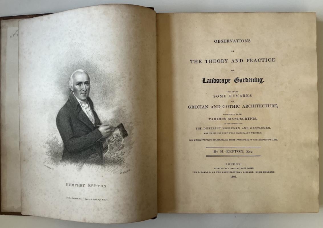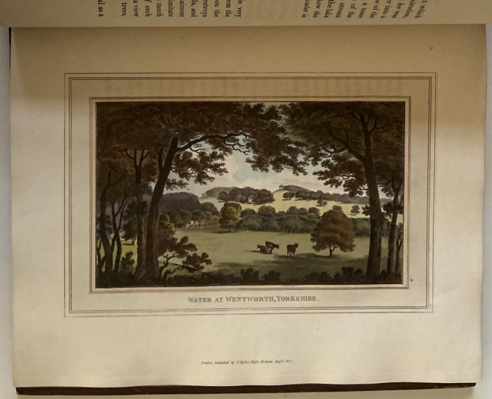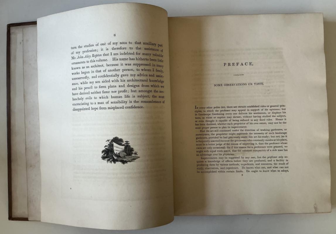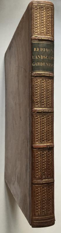 Full title reads: Observations on the Theory and Practice of Landscape Gardening. Including some remarks on Grecian and Gothic Architecture, collected from Various Manuscripts, in the possession of the different noblemen and gentlemen, for whose use they were originally written; the whole tending to establish fixed principles in the respective arts. By H. Repton, Esq. First edition. Large quarto; page size approx 34cm x 27.2cm, pp [1-6], 7-16; 220 (2). The contents therefore run; title page, dedication to the king, advertisement, preface, list of places referred to, followed by the text itself, and a two page index, including list of plates to verso, to the rear. Illustrations all present as follows: portrait frontispiece, 27 plates comprising 11 hand-coloured aquatint plates (9 with overlays, and one folding), 14 engraved plates (mostly aquatint, some tinted, 3 with overlays, one double-page) and 2 engraved maps (1 hand-coloured), 11 aquatint vignettes and illustrations in text, 2 with overlays, illustrations in the text. Binding: contemporary full calf, boards somewhat rubbed, early reback, gilt spine relaid. Elegant armorial bookplate to rear pastedown with the motto Pax et Spes (the motto of the Pease family, adopted by the first Baron Wardington). Bookplate with woodcut to front pastedown with the name Helen and Elizabeth Pease.