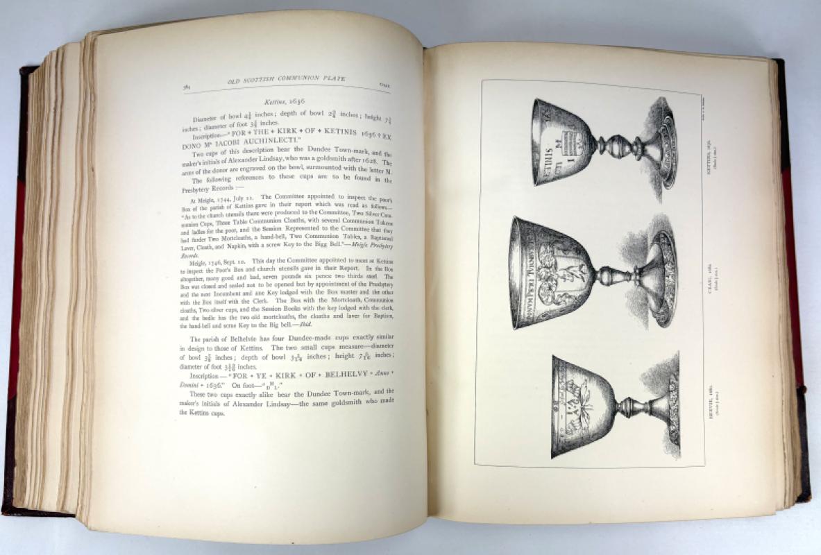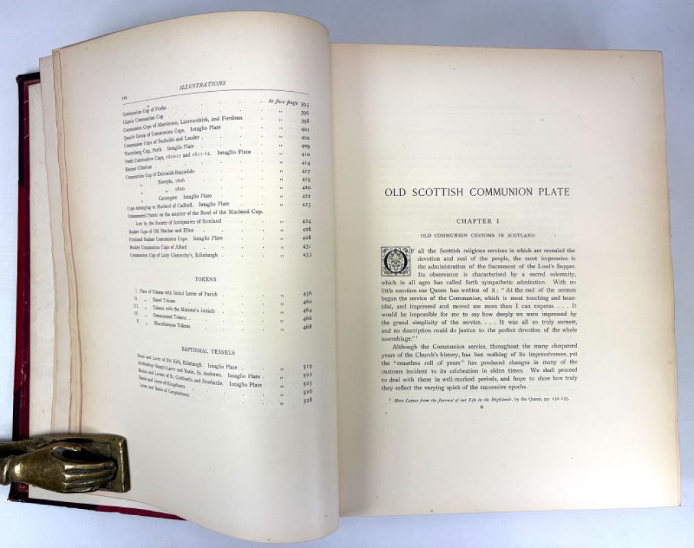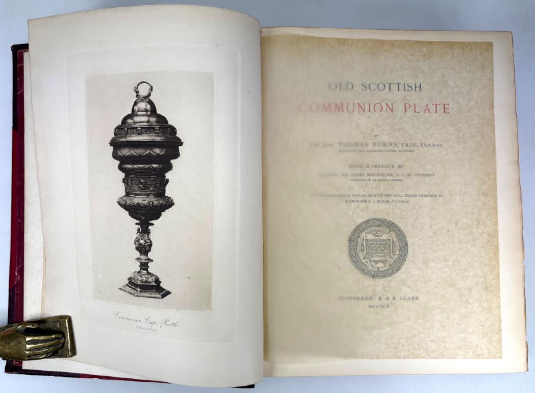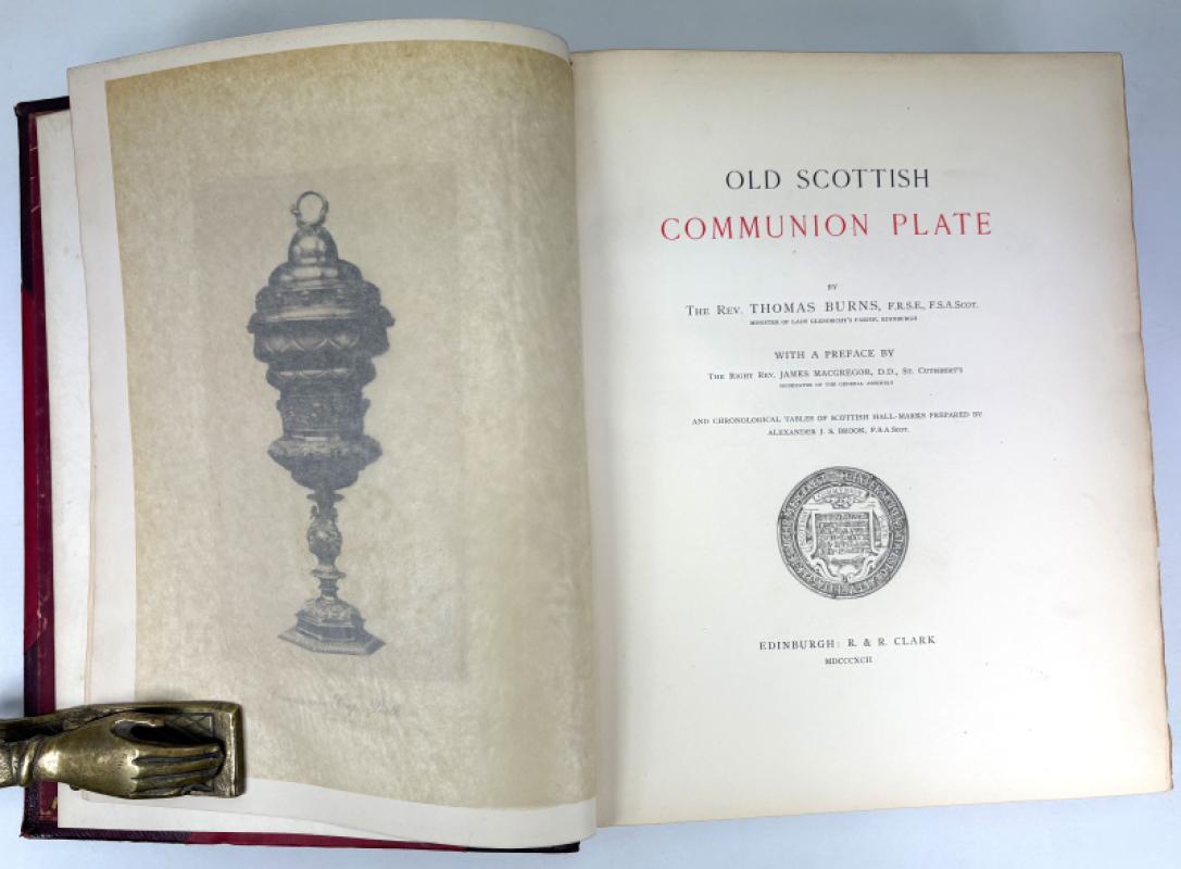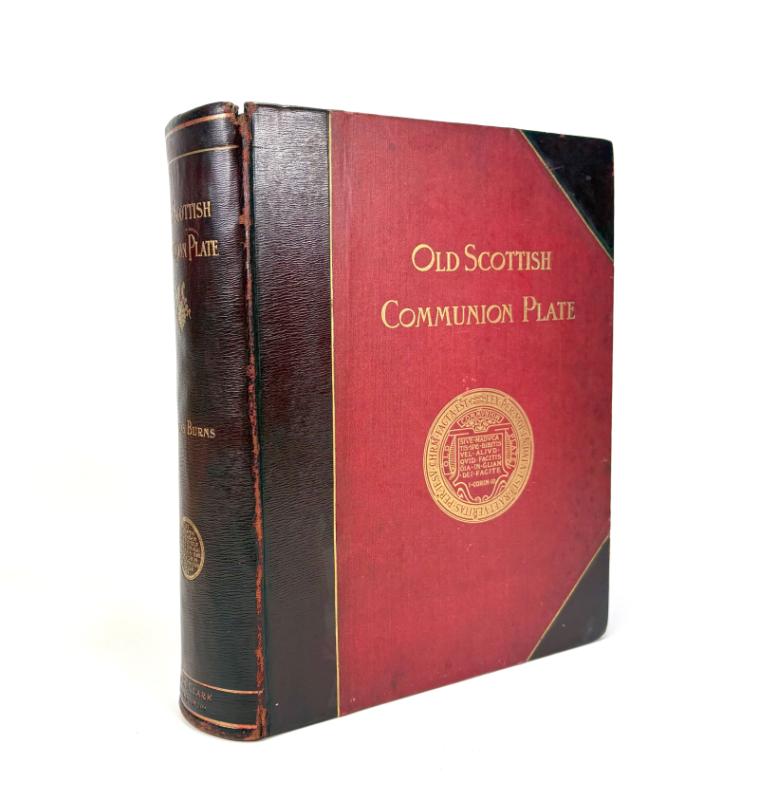 A substantial and scholarly late-Victorian study of Scottish ecclesiastical silver. Rev. Thomas Burns’s Old Scottish Communion Plate (1892) remains the definitive reference work on the subject, documenting the design, history, and use of communion vessels across Scotland. The volume includes a preface by the Moderator of the General Assembly, James MacGregor, and valuable chronological tables of Scottish hallmarks compiled by Alexander J.S. Brook. Illustrated throughout with numerous plates and engravings, it is both an important work of church history and a key reference for collectors of Scottish silver. Old Scottish Communion Plate, by the Rev. Thomas Burns, F.R.S.E., F.S.A. Scot., Minister of Lady Glendorch's Parish, Edinburgh. With a Preface by The Right Rev. James MacGregor, D.D., St Cuthbert's, Moderator of the General Assembly, and Chronological Tables of Scottish Hall-marks prepared by Alexander J.S. Brook, F.S.A. Scot. Published in Edinburgh by R. & R. Clark, 1892. Limited to 175 copies on large paper. This numbered 69 and is signed by the author. A good hardback in original Publisher's binding - burgundy leather spine and corners with gilt decoration, rules and titles. With red cloth over boards with gilt title and roundel to front cover. The covers with some rubbing, bumping and wear. Outer joints are rubbed, but all soundly bound. Text is bright and clean throughout, with clean and attractive plates. Burgundy endpapers with some rubbing. With gilt top edge to text block. A very usable copy of this substantial and comprehensive work. Text in English. xxx + 651pp + Numerous illustrations and Plates (some with tissue guards). Dimensions: approximately 295mm high x 248mm wide x 72mm. Approximate weight 3.5kg (unpacked).