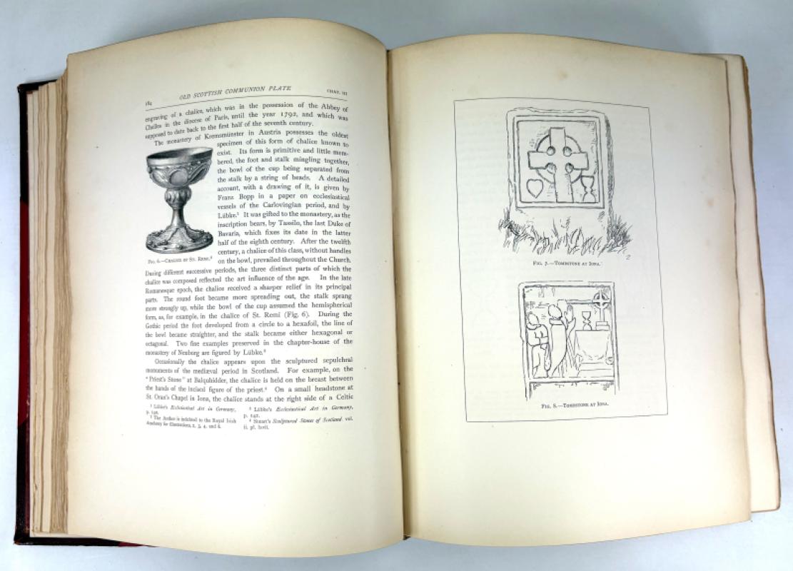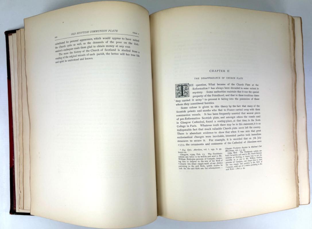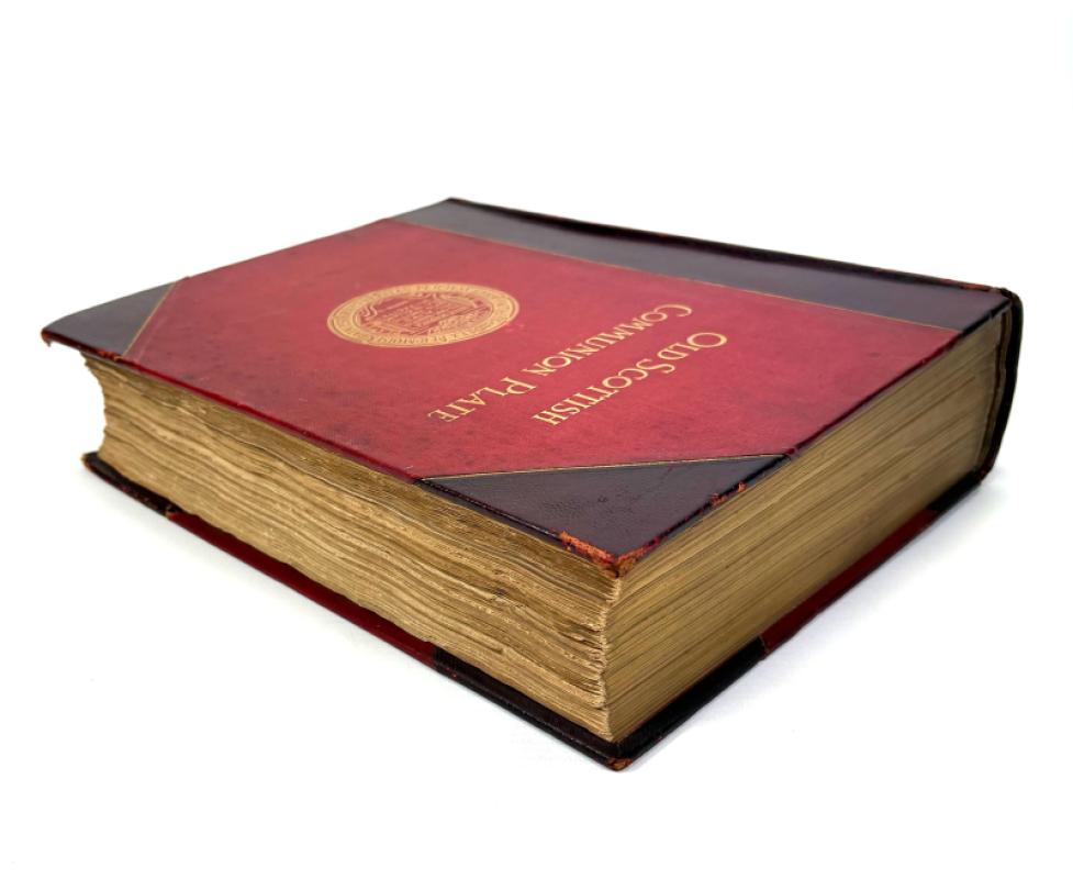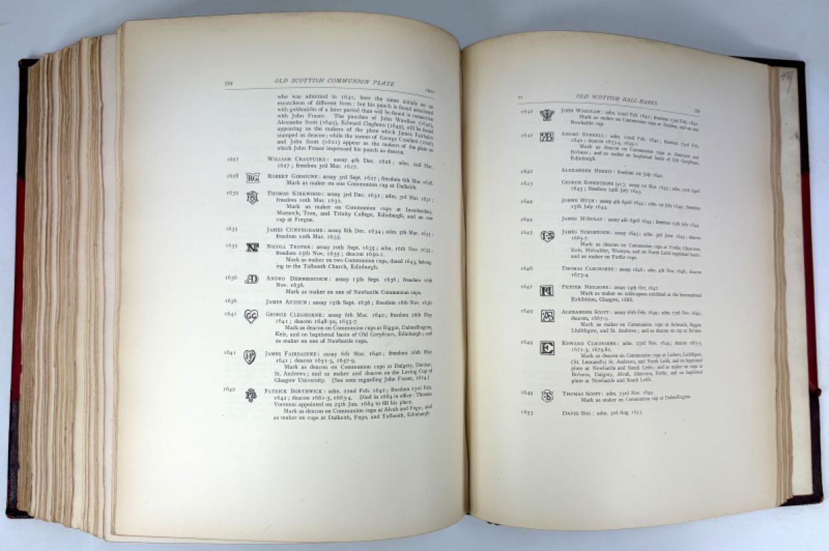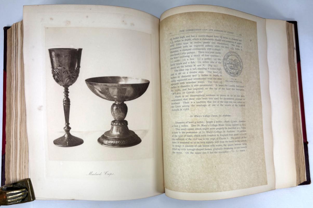 A substantial and scholarly late-Victorian study of Scottish ecclesiastical silver. Rev. Thomas Burns’s Old Scottish Communion Plate (1892) remains the definitive reference work on the subject, documenting the design, history, and use of communion vessels across Scotland. The volume includes a preface by the Moderator of the General Assembly, James MacGregor, and valuable chronological tables of Scottish hallmarks compiled by Alexander J.S. Brook. Illustrated throughout with numerous plates and engravings, it is both an important work of church history and a key reference for collectors of Scottish silver. Old Scottish Communion Plate, by the Rev. Thomas Burns, F.R.S.E., F.S.A. Scot., Minister of Lady Glendorch's Parish, Edinburgh. With a Preface by The Right Rev. James MacGregor, D.D., St Cuthbert's, Moderator of the General Assembly, and Chronological Tables of Scottish Hall-marks prepared by Alexander J.S. Brook, F.S.A. Scot. Published in Edinburgh by R. & R. Clark, 1892. Limited to 175 copies on large paper. This numbered 69 and is signed by the author. A good hardback in original Publisher's binding - burgundy leather spine and corners with gilt decoration, rules and titles. With red cloth over boards with gilt title and roundel to front cover. The covers with some rubbing, bumping and wear. Outer joints are rubbed, but all soundly bound. Text is bright and clean throughout, with clean and attractive plates. Burgundy endpapers with some rubbing. With gilt top edge to text block. A very usable copy of this substantial and comprehensive work. Text in English. xxx + 651pp + Numerous illustrations and Plates (some with tissue guards). Dimensions: approximately 295mm high x 248mm wide x 72mm. Approximate weight 3.5kg (unpacked).
