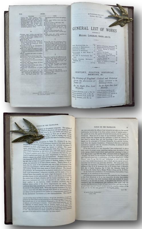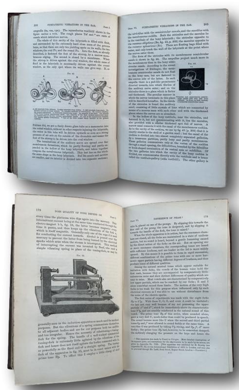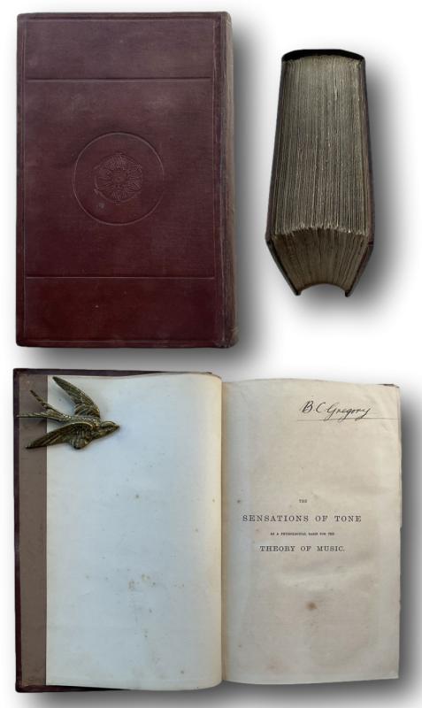 A good clean sound copy of the First English Edition of this foundational work on the perception of sound and music acoustics translated by Alexander Ellis from the third German edition of 1870 and with an xi.pp notice by him dated 4th June 1875 (the publishers catalogue is dated March 1876) Med.8vo. xxiv, 824, plus 44pp Longmans, Green & Co.catalogue. Original publisher's cloth and fawn coated endpapers with the name B.C.Gregory to the paste down and again to the half title. Joints strengthened and other signs of restoration