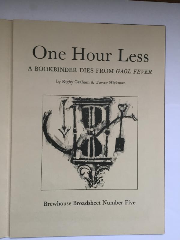 ‘One Hour Less – A Bookbinder Dies From Gaol Fever’ ~ by Rigby Graham & Trevor Hickman; pub by Brewhouse Press 1968; Broadsheet no 5; limited to 200 copies; good condition.