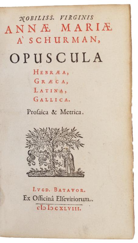 FIRST EDITION OF AN INFLUENTIAL COLLECTION OF WRITINGS BY THE CELEBRATED SCHOLAR AND LINGUIST ANNA MARIA VAN SCHURMAN, ‘THE DUTCH MINERVA’