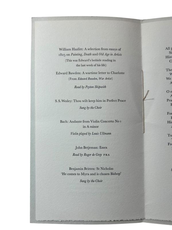Other readings and performances include ‘Edward Bawden: A wartime letter to Charlotte’ by Peyton Skipwith; ‘S.S. Wesley: Thou wilt keep him in Perfect Peace’ by the Choir; ‘Bach: Andante from Violin Concerto No 1 in A minor’ by Louis Ullmann; ‘John Betjeman: Essex’ by Roger de Grey; ‘Benjamin Britten: St. Nicholas’ by the Choir; the Address by Sir Hugh Casson and others. The footnote reads: ‘Edward Bawden died peacefully at his home in Saffron Walden on Tuesday 21 November 1969’. This beautiful, but touching pamphlet is in fine condition.