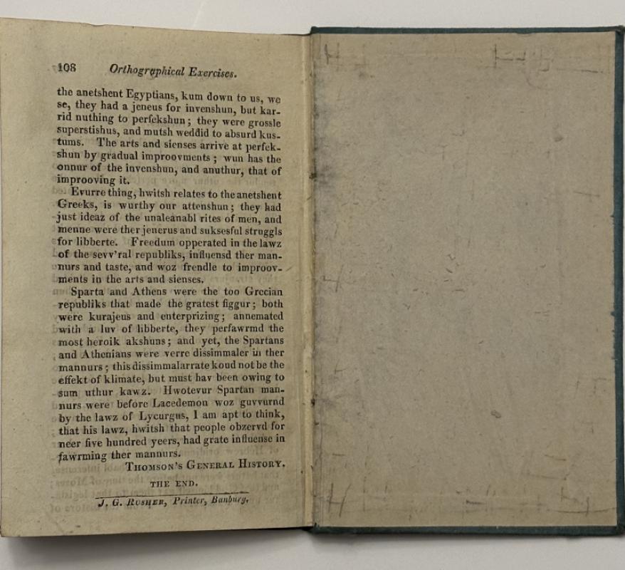 108 pages. Words are printed phonetically, the book seems to have been first printed in the 1790s. This an interesting provincial printing of the text. No free end papers. Pencil scribbling to the pages has been partly erased at some point. In silk[?] covered boards that are now stained.