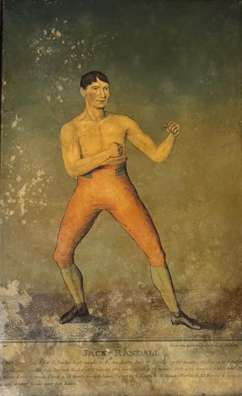 With engraved text below, reading: "Jack Randall born Nov. 25, 1794, 5 feet, 6 inches high, weighs 10 st. 6 lb; has beaten Jack the Butcher in 20 minutes, Walton in 10 minutes, Geo. Dodd in 25 minutes, Ugly Borrock the Jew in 12 minutes, West Country Dick in 33 minutes, Holt in 25 minutes & only 8 rounds, Belasco in 54 minutes & only 7 rounds, Parish in 53 minutes & only 11 rounds, Turner in 2 hours & 16 minutes, Martin in 53 minutes & many others of less note, in short he has never been beaten." He ultimately had a 16-0-1 record - all of his wins were knockouts. He was elected to the International Boxing Hall of Fame in 2005.